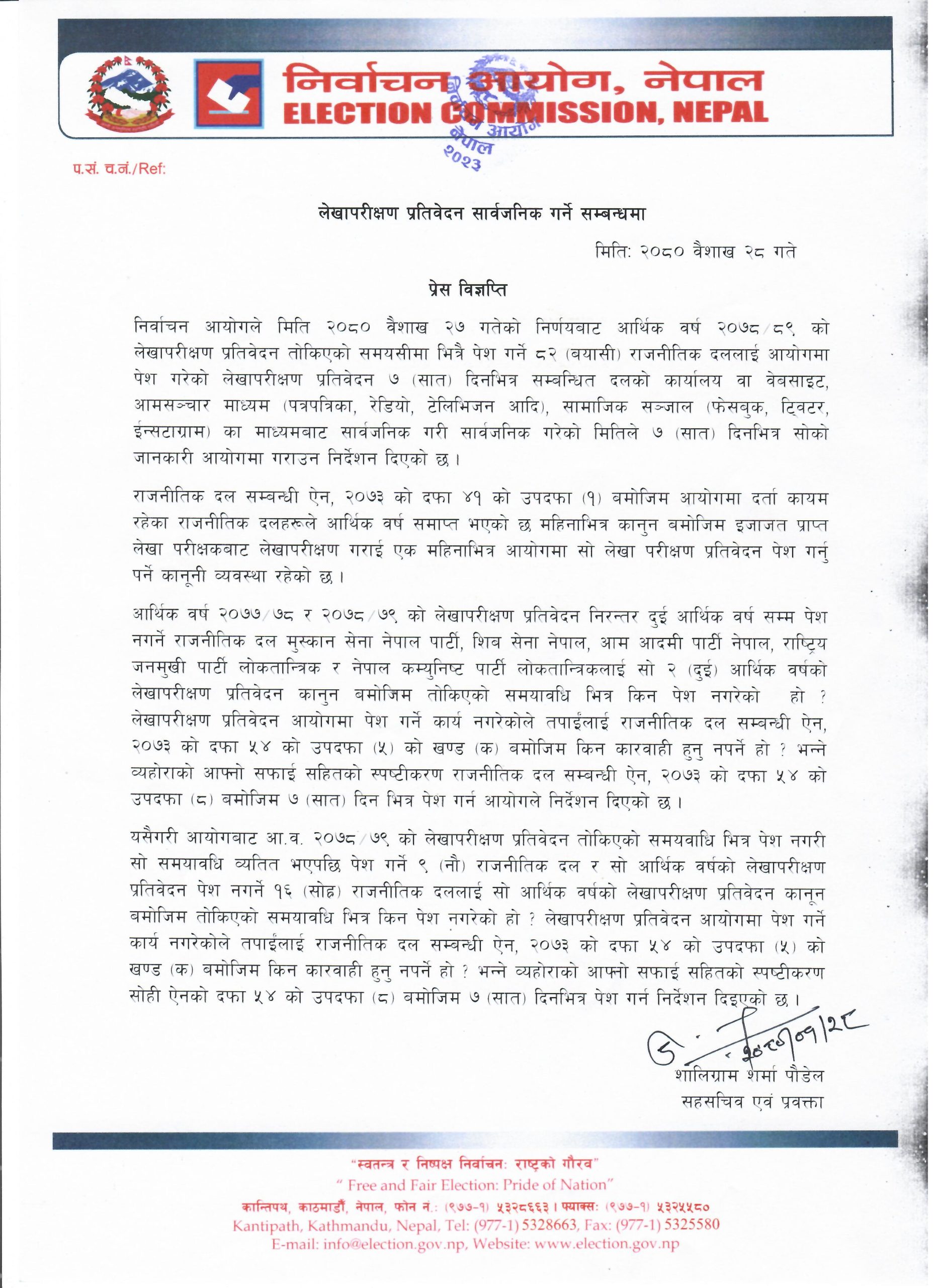 ‘आर्थिक वर्ष २०७८/७९ को लेखा परीक्षण प्रतिवेदन तोकिएको समयसीमाभित्रै पेस गर्ने ८२ (बयासी) राजनीतिक दललाई आयोगमा पेस गरेको लेखा परीक्षण प्रतिवेदन ७ (सात) दिनभित्र सम्बन्धित दलको कार्यालय वा वेबसाइट, आमसञ्चारमाध्यम (पत्रपत्रिका, रेडियो, टेलिभिजन आदि), सामाजिक सञ्जाल (फेसबुक, ट्विटर, ईन्स्टाग्राम) का माध्यमबाट सार्वजनिक गरी सार्वजनिक गरेको मितिले ७ (सात) दिनभित्र सोको जानकारी आयोगमा गराउन निर्देशन दिएको छ,’ आयोगले विज्ञप्तिमार्फत भनेको छ ।