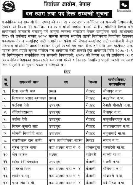 २०७४ सालको पालिकाको चुनावमा माओवादी केन्द्रको तर्फबाट उम्मेद्वार भएर विजयी भएका तर दल त्याग गरेका उनीहरुलाई माओवादी केन्द्रले पदमुक्त गर्न माग गर्दै निर्वाचन आयोगलाई जानकारी गराएको थियो ।