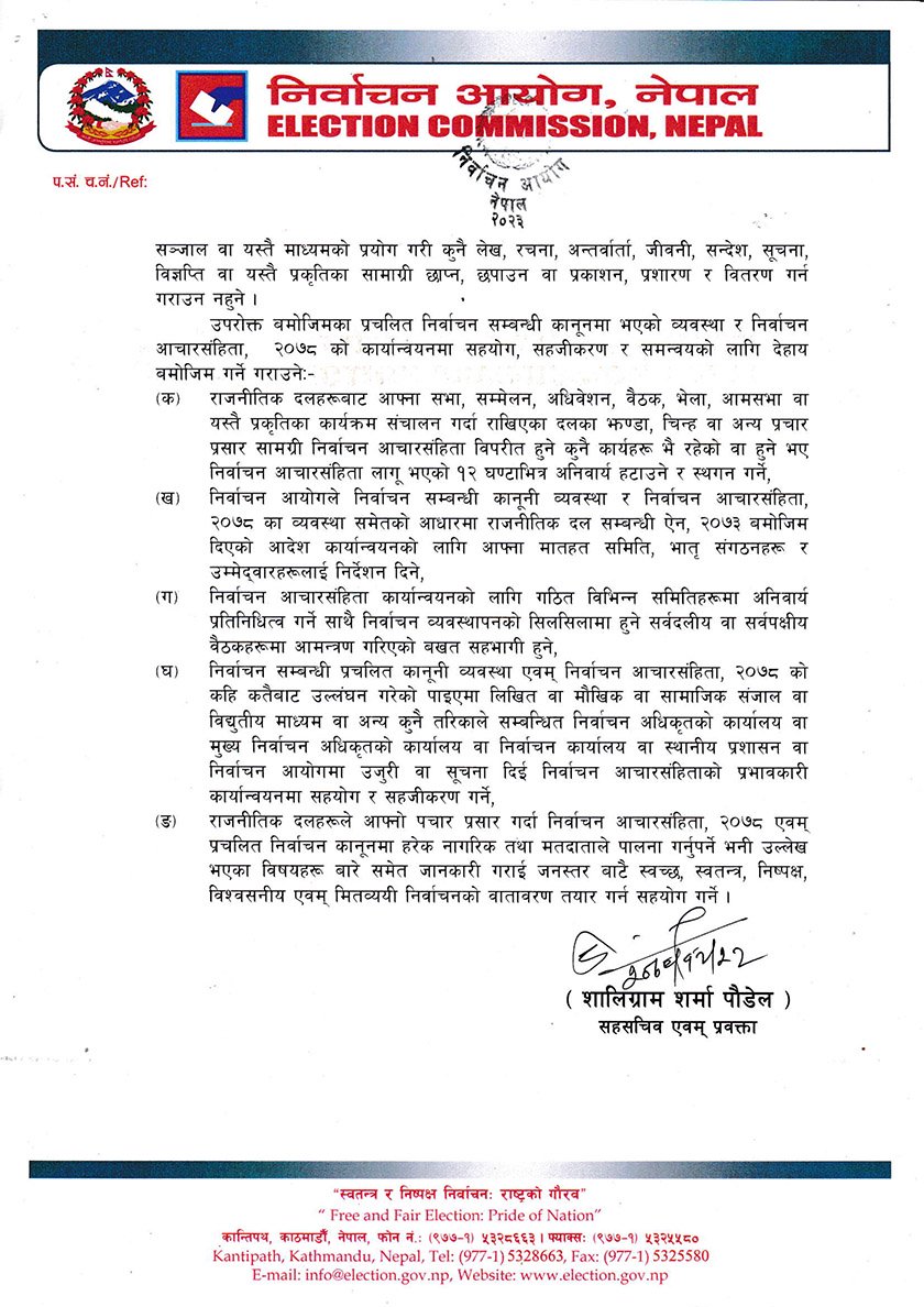 मंगलबार निर्वाचन आयोगले ७९ दलहरूसँग निर्वाचन आचारसंहिताको विषयमा छलफल गरेको थियो । छलफलपछि आयोगले दलहरूलाई निर्वाचन आचारसंहिता पालना गर्न भन्दै ६० बुँदे निर्देशन दिएको हो ।