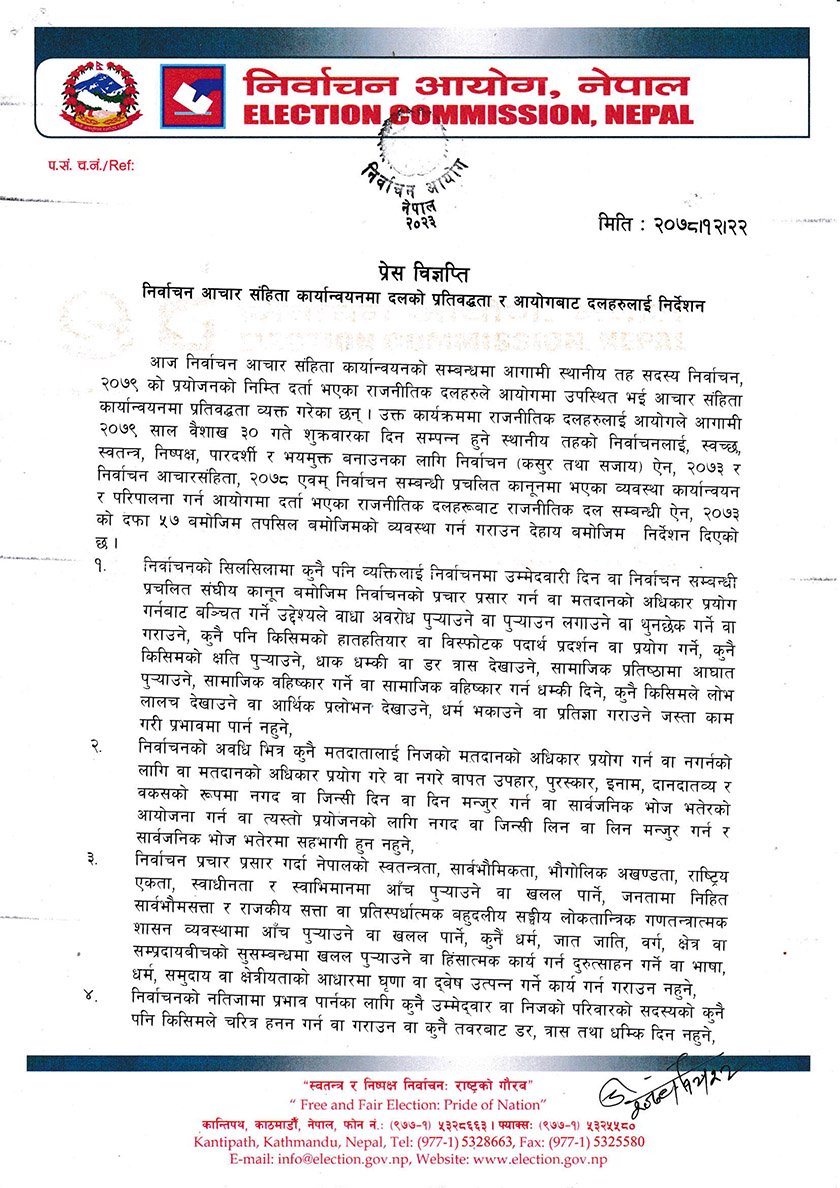 आयोगले वैशाख ३० को स्थानीय तह निर्वाचन प्रयोजनका लागि दर्ता भएका दलहरुले आयोगमा उपस्थित भई आचार संहिता कार्यान्वयनमा प्रतिबद्धता व्यक्त गरेको दाबी गरेको छ । तर नेकपा एमाले सहितका केहीले भने प्रतिबद्धतामा हस्ताक्षर गरेका छैनन् ।