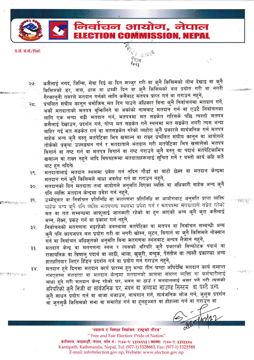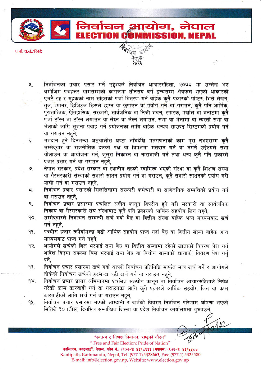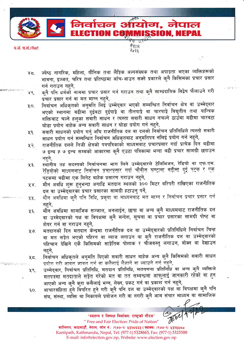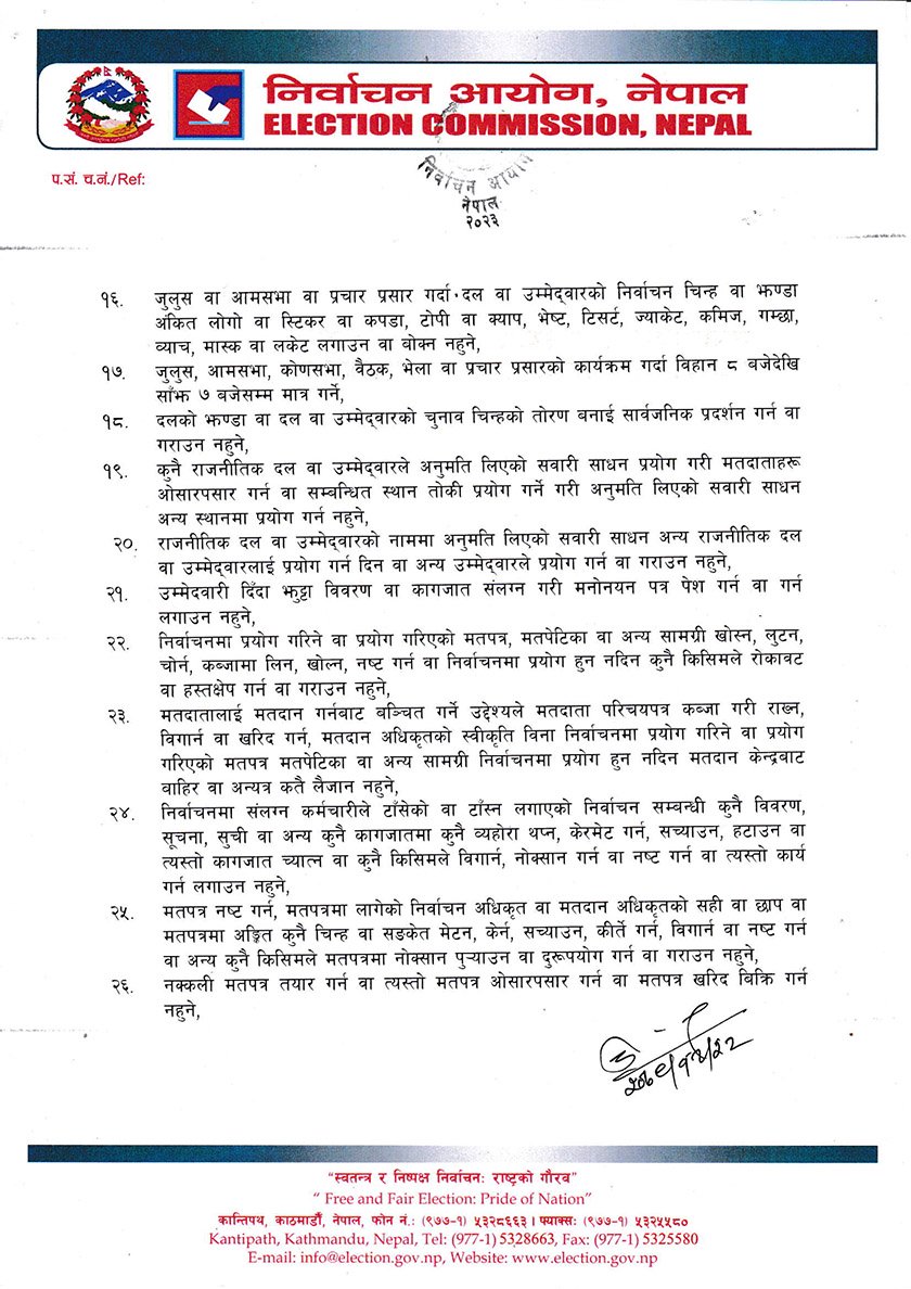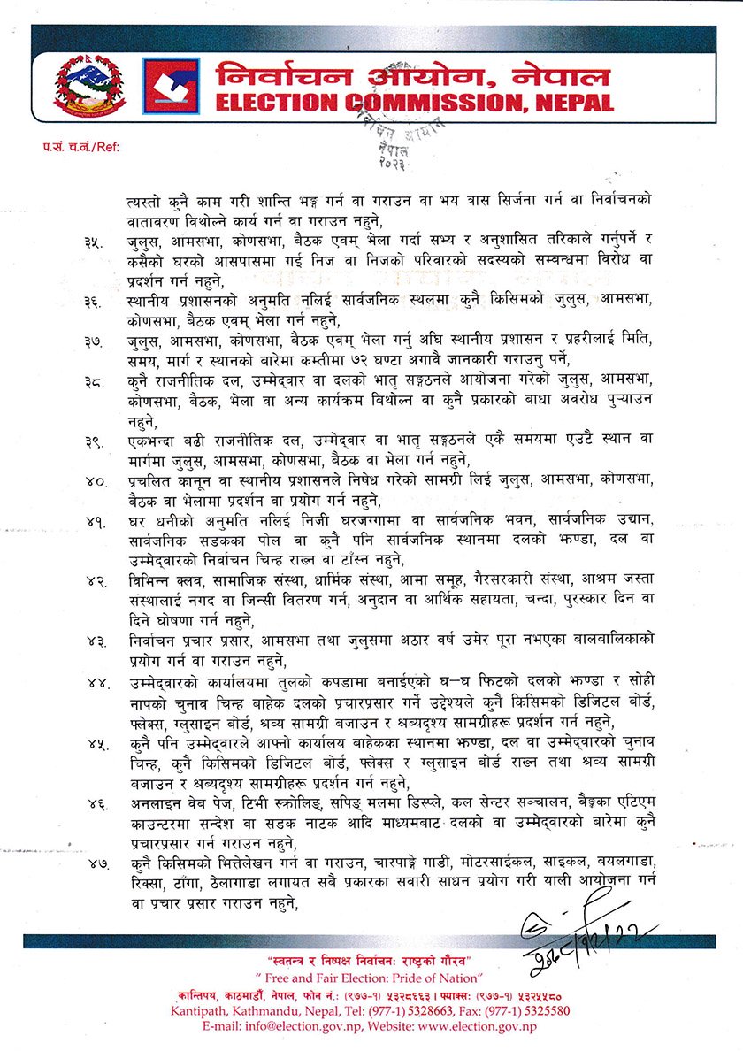 मंगलबार निर्वाचन आयोगले ७९ दलहरूसँग निर्वाचन आचारसंहिताको विषयमा छलफल गरेको थियो । छलफलपछि आयोगले दलहरूलाई निर्वाचन आचारसंहिता पालना गर्न भन्दै ६० बुँदे निर्देशन दिएको हो ।