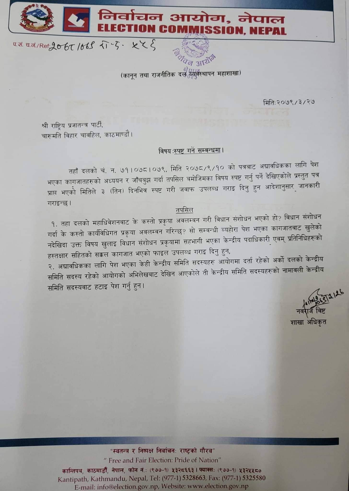 आयोगले राप्रपाको हालै सम्पन्न महाधिवेशनबाट के कस्तो प्रक्रिया अवलम्बन गरी विधान संशोधन भएको हो ? विधान संशोधन गर्दा के कस्तो कार्यविधिगत प्रक्रिया अवलम्बन गरिन्छ ? सोसम्बन्धी व्यहोरा पेस भएका कागजातबाट खुलेको नदेखिएको भन्दै आयोगले खुलाउँदै विधान संशोधन प्रक्रियामा सहभागी भएका केन्द्रीय पदाधिकारी एवं प्रतिनिधिहरूको हस्ताक्षरसहितको सक्कल कागजात भएको फाइल उपलब्ध गराइदिन आग्रह गरेको छ ।