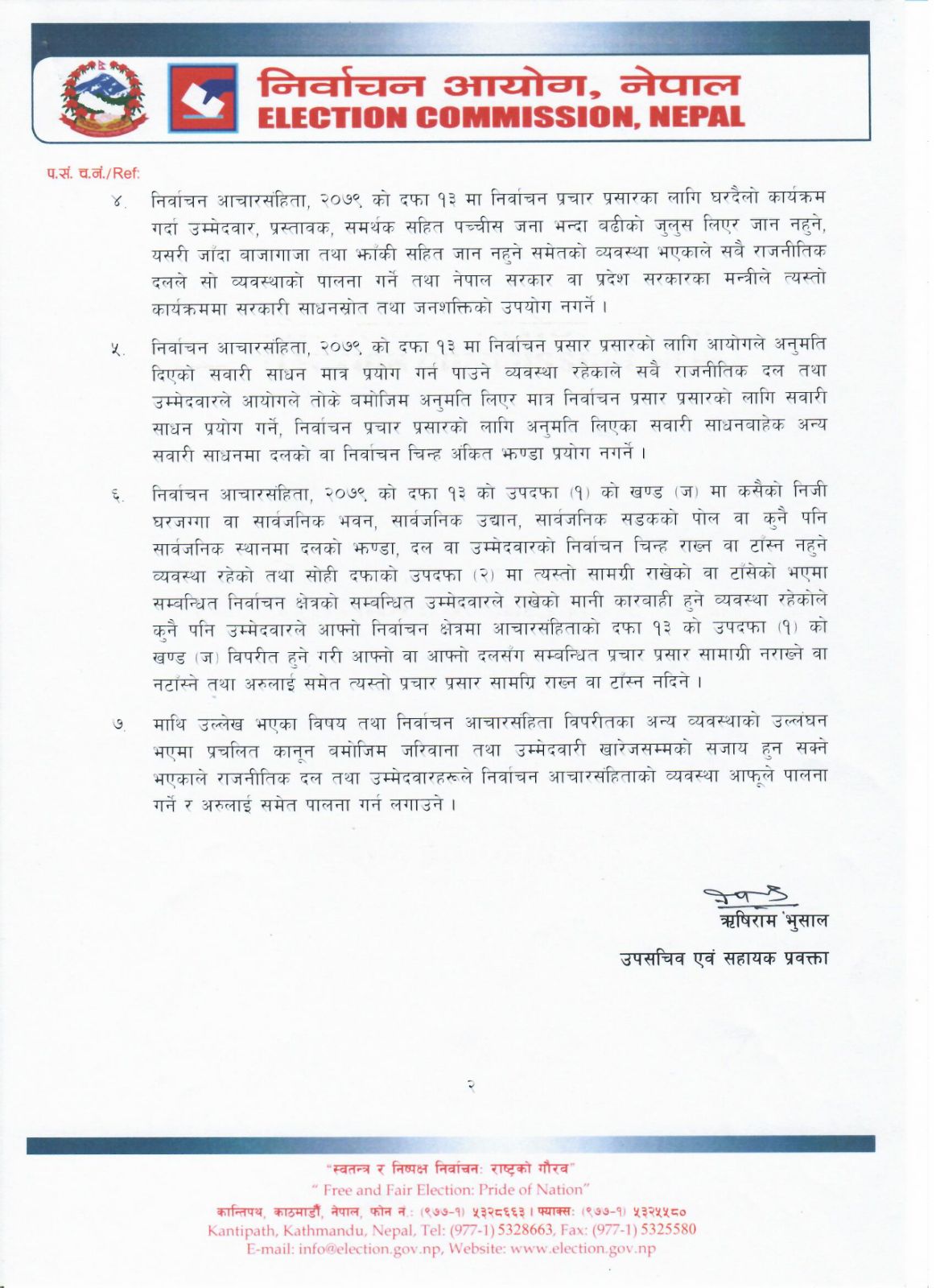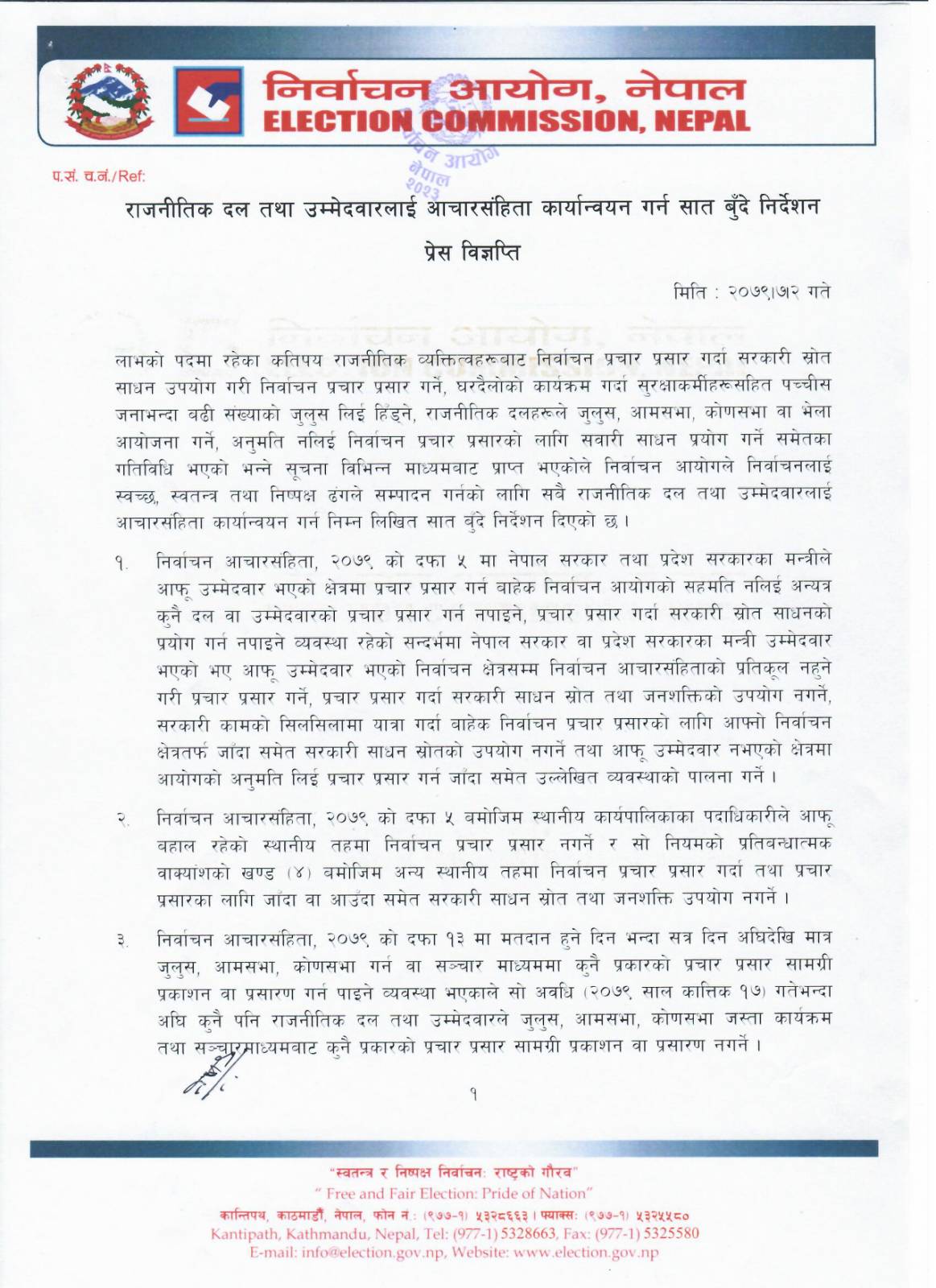 आयोगका सहायक प्रवक्ता ऋषिराम भुसालले एक प्रेस विज्ञप्ति जारी गर्दै निर्वाचन आचारसंहिता विपरीतका अन्य व्यवस्थाको उल्लङ्घन भएमा प्रचलित कानून बमोजिम जरिवाना तथा उम्मेदवारी खारेजसम्मको सजाय हुन सक्ने भन्दै सात बुँदे निर्देशन दिएका हुन् ।