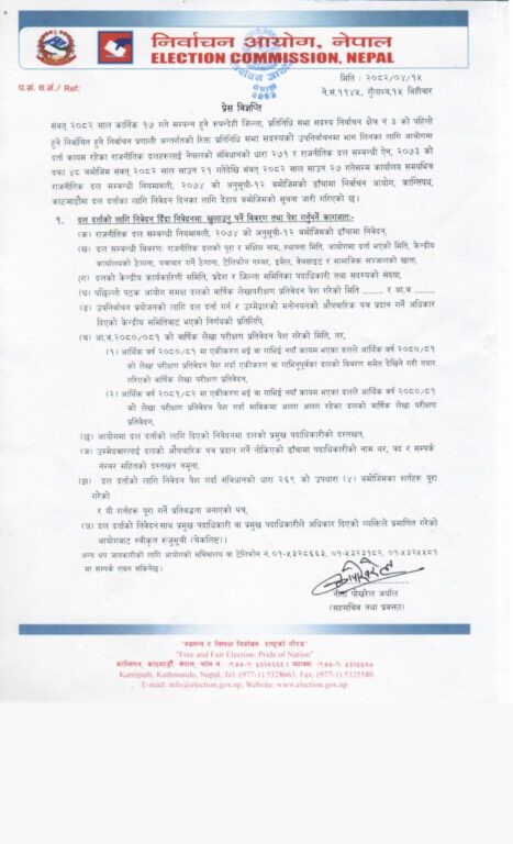 आयोगले शुक्रबार सूचना जारी गर्दै साउन २१ देखि २७ गतेसम्म आयोगका केन्द्रीय कार्यालयमा दल दर्ताका लागि निवेदन दिन सकिने जनाएको हो। आयोगले यसअघि उपनिर्वाचनका लागि निर्वाचन कार्यतालिका स्वीकृत गरिसकेको छ।