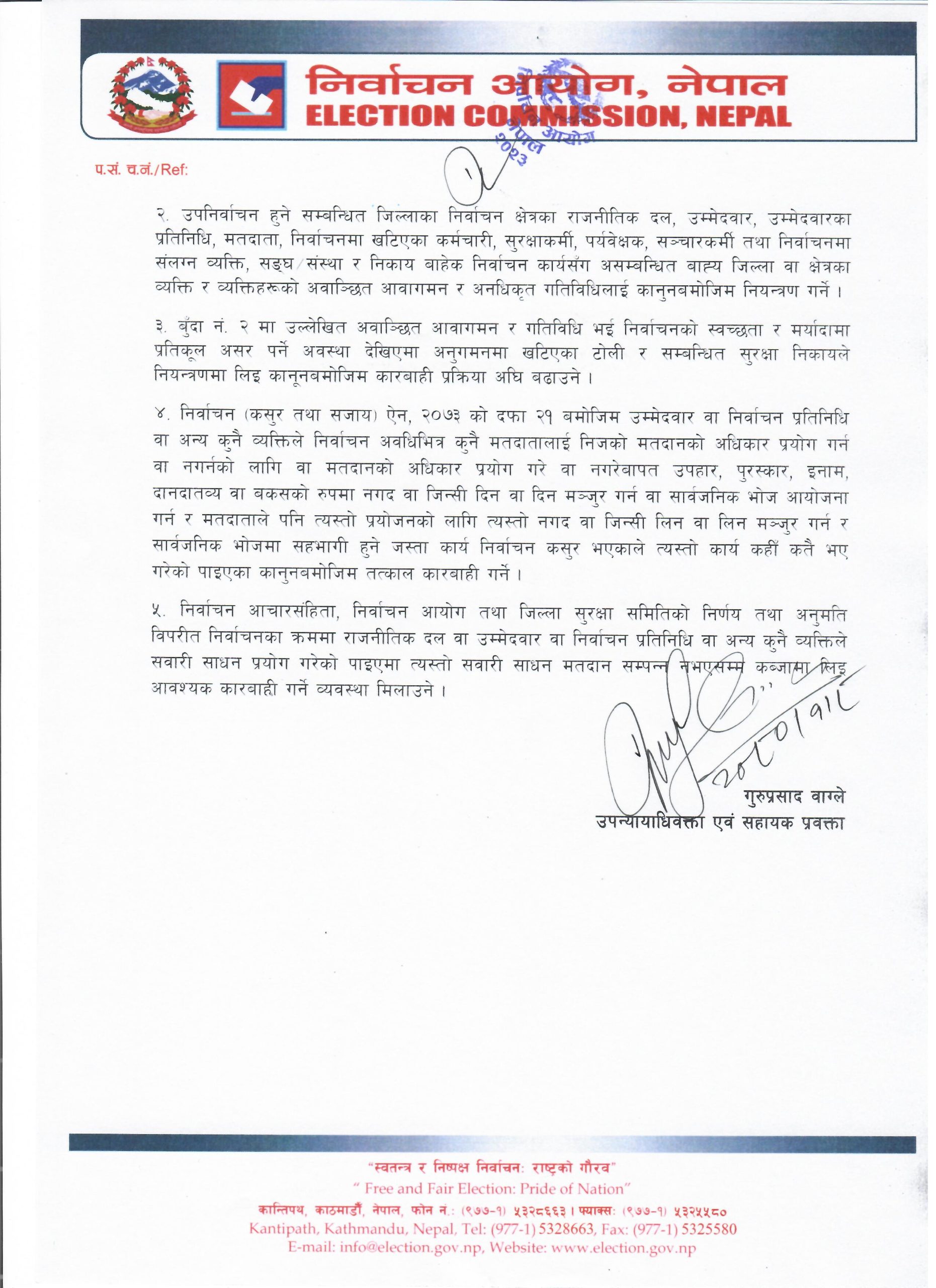 काठमाण्डु – निर्वाचन आयोगले बेशाख १० गते हुने उपनिर्वाचनको आचारसंहिता विपरीतका गतिविधि कडाइका साथ अनुगमन र निगरानी गर्न सरोकारवालालाई निर्देशन दिएको छ ।