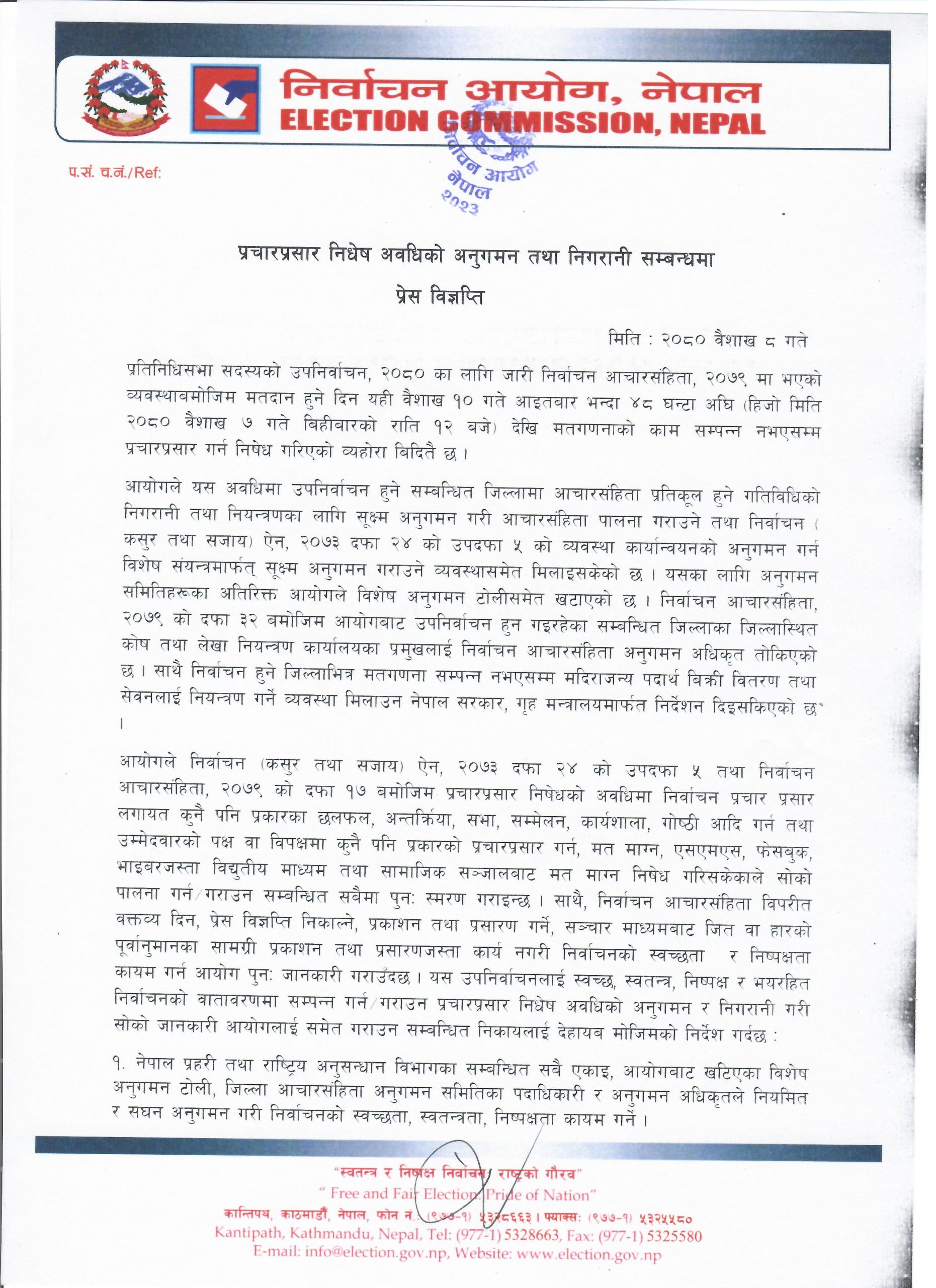 वैशाख १० गते आइतबार भन्दा ४८ घण्टा अघिदेखि मतगणनाको काम सम्पन्न नभएसम्म प्रचारप्रसार गर्न निषेध गर्नेगरी आयोगले गएरातिदेखि मौन अवधि लागू गरेको छ । विज्ञप्तिमा निर्वाचन आचारसंहिता, २०७९ को दफा ३२ बमोजिम सम्बन्धित जिल्लाका कोष तथा लेखा नियन्त्रण कार्यालयका प्रमुखलाई निर्वाचन आचारसंहिता अनुगमन अधिकृत तोकिएको पनि उल्लेख छ ।