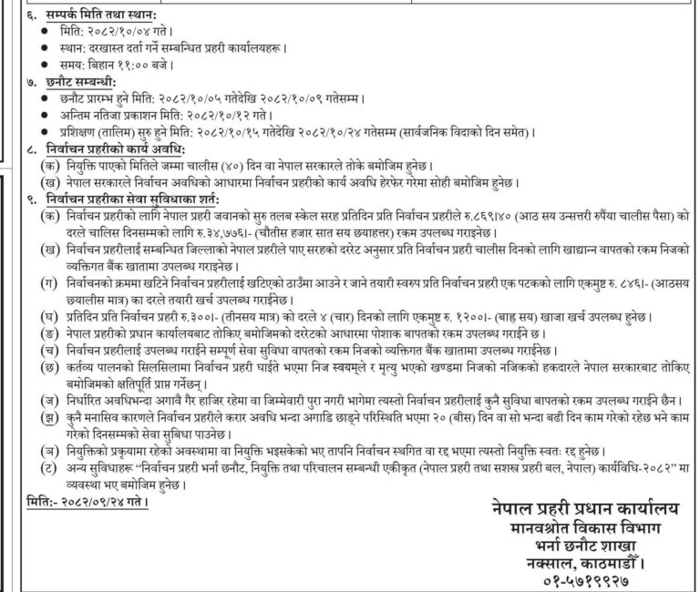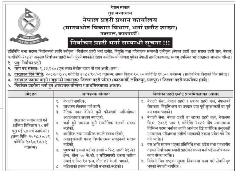 नेपाल प्रहरी प्रधान कार्यालय, मानवस्रोत विकास विभाग अन्तर्गत भर्ना छनोट शाखाले बिहीवार सूचना प्रकाशित गर्दै योग्यता पुगेका नेपाली नागरिकबाट निर्वाचन प्रहरीका लागि दरखास्त आह्वान गरेको हो।