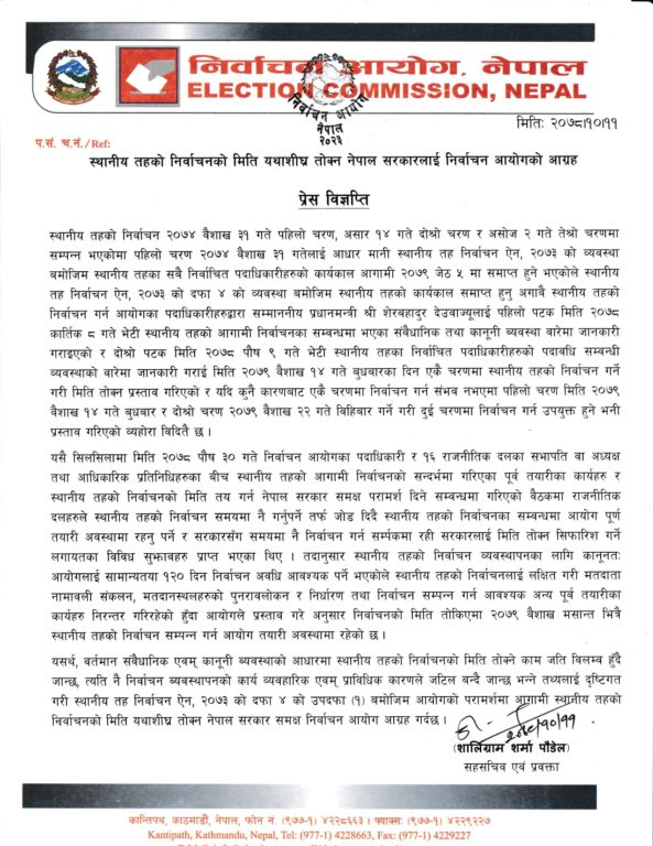 काठमाण्डु – निर्वाचन आयोगले तत्काल स्थानीय तहको निर्वाचन मिति तोक्न सरकारसँग आग्रह गरेको छ ।