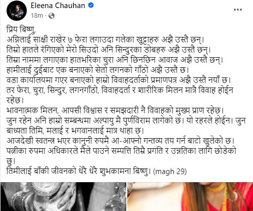 एलिनाले आज सामाजिक सञ्जाल फेसबुकमा एम पोस्ट सेयर गर्दै कानुनी रुपमै अलग भएको जानकारी दिएकी हुन् ।