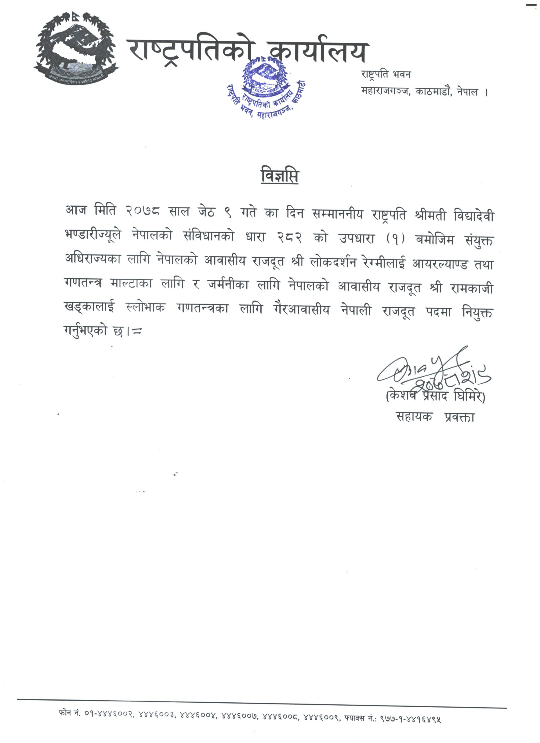 साथै जर्मनीका लागि नेपालको आवासीय राजदूत रामकाजी खड्कालाई स्लोभाक गणतन्त्रका लागि गैरआवासीय नेपाली राजदूत पदमा नियुक्त गरिएको राष्ट्रपति कार्यालयले जनाएको छ ।