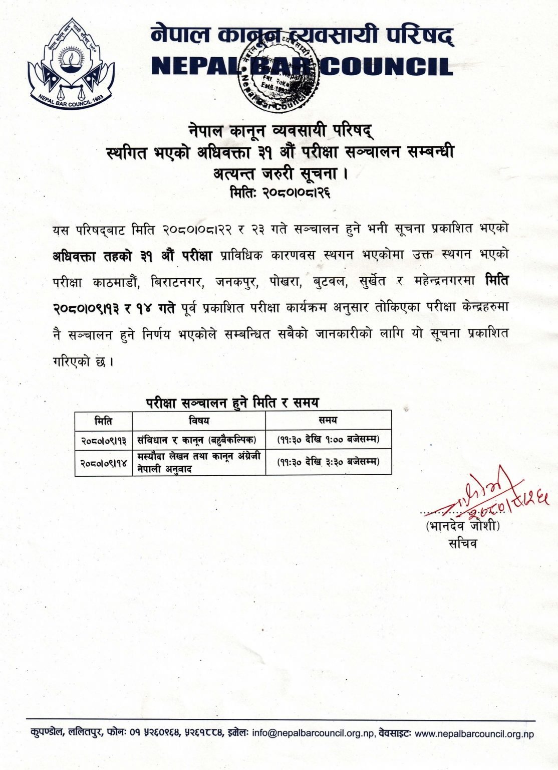 नेपाल बार काउन्सिलले आज मंगलबार सूचना जारी गर्दै यसअघि तोकिएकै परीक्षा केन्द्रमा परीक्षा हुने सचिव भानदेव जोशीले जानकारी दिए ।