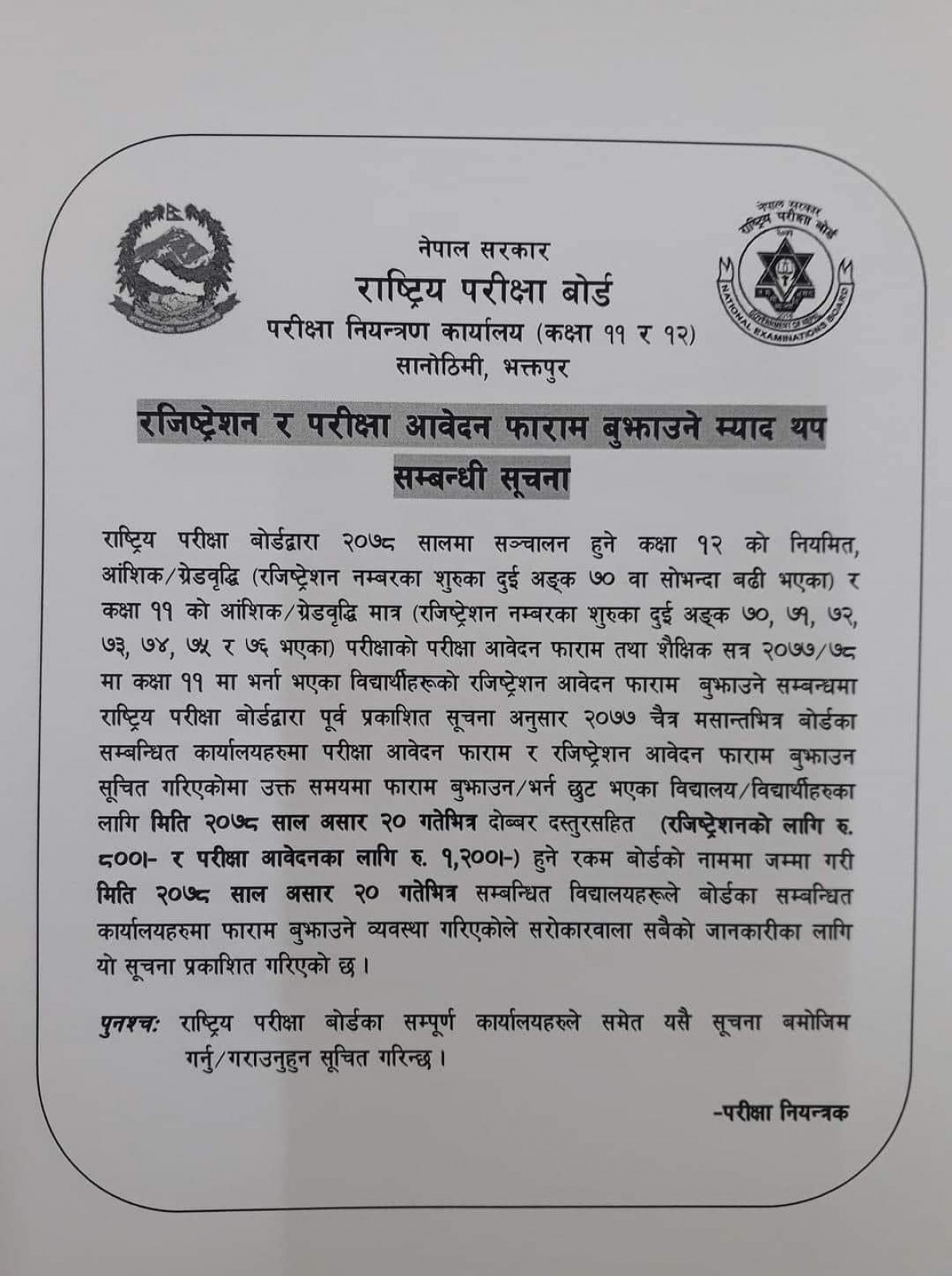 २०७८ सालमा हुने कक्षा १२ को नियमितका साथै आशिंक र ग्रेड बृध्दिका साथै कक्षा ११ को परीक्षाको फारम र रजिष्ट्रेशन फारम बुझाउने मिति यसअघि चैत्र मसान्त सम्म रहेको थियो ।