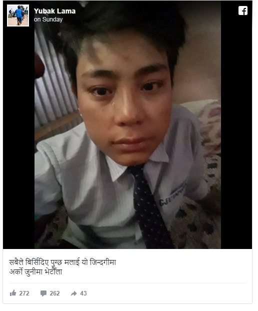 सामाजिक सञ्जाल फेसबुकमा उनले रुँदै राखेका तस्विर सहितको स्टाटसबाट उनी केहि समस्यामा रहेको देखिन्छ ।  आइतबार मध्यान्न १२ बजेर ४५ मिनेटमा आफ्नो फेसबुकमा राखेको फोटोको क्याप्सनमा उनले लेखेका छन् ‘सबैले बिर्सिदिए हुन्छ मलाई यो जिन्दगीमा अर्को जुनीमा भेटौंला’ ।