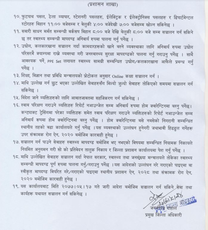 फर्निचर र अटो मोबाइल सम्बन्धी पसल साताको सोमबार र बुधबार मात्र खोल्न सकिनेछ । त्यस्तै फुटपाथ पसल, ठेला व्यापार, स्टेशनरी पसलहरु इलेक्ट्रिोनिक्स पुलहरु र डिपार्टमेन्टल स्टोरहरु बिहान ११ बजेसम्म र बेलुकी ४ बजेदेखि ७ बजेसम्म खोल्न सकिनेछ । त्यस्तै प्रशासनले सवारी साधन मर्मत सम्बन्धी वर्कसप बिहान ८ बजेदेखि बेलुकी ८ बजेसम्म सञ्चालन गर्न सकिने जनाएको छ ।