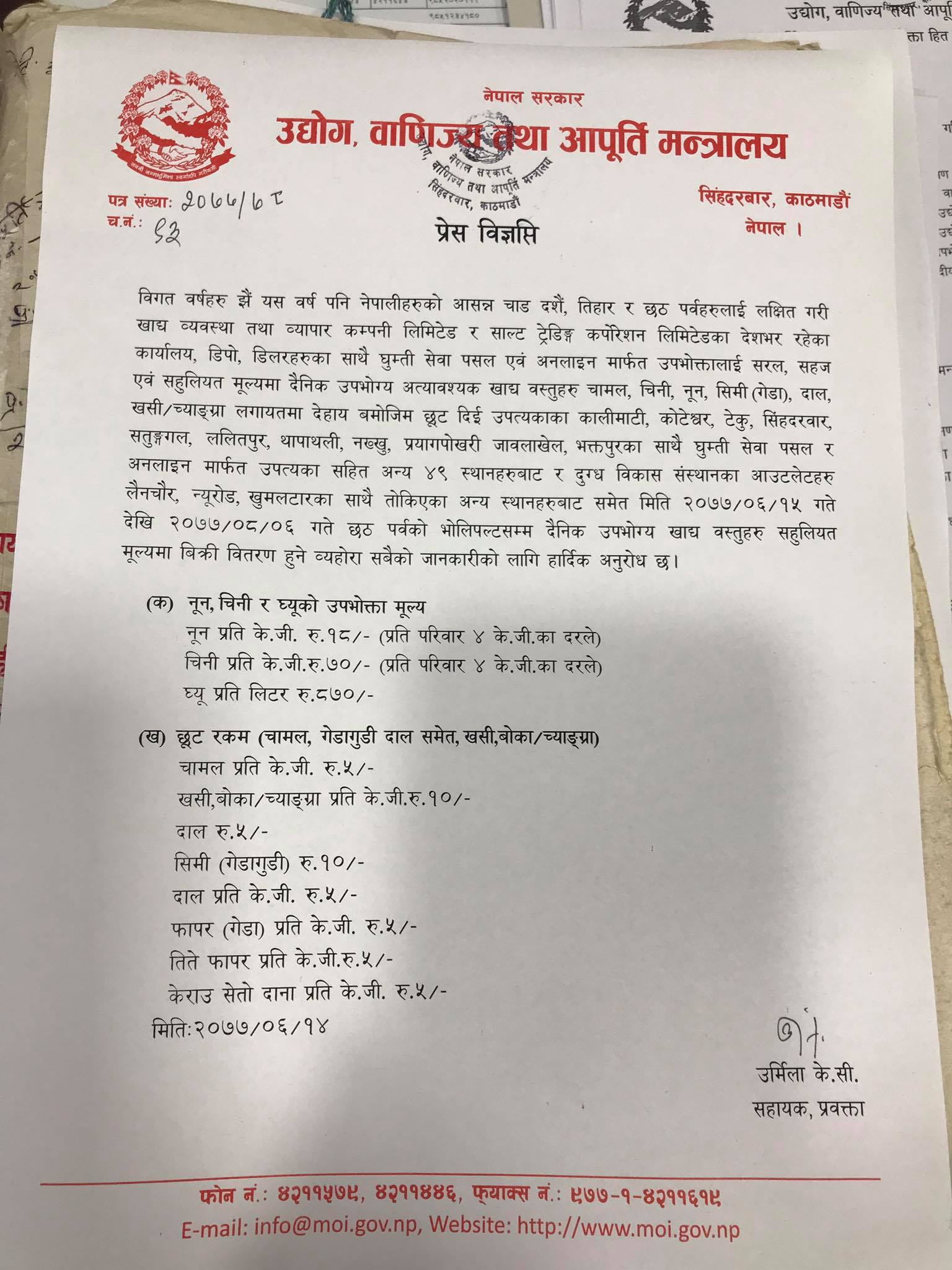 मन्त्रालयकी सहायक प्रवक्ता उर्मिला केसीले चाडपर्वलाई लीष्गात गर्दै मन्त्रालयले सुपथ मूल्य पसल सञ्चालनमा ल्याउको जानकारी दिइन् ।