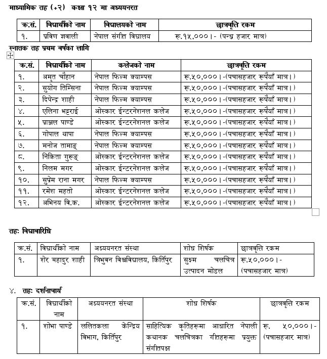 बोर्डका अध्यक्ष दिनेश डिसीले छात्रवृत्तिवापतको रकम सम्बन्धित कलेजलाई हस्तान्तरण गरेका छन् । अध्यक्ष डिसीले माध्यमिक र स्नातक तहका विद्यार्थीको छात्रवृत्ति ओस्कार इन्टरनेसनल कलेजको संयोजक नवनिधि दाहाल, नेपाल फिल्म क्याम्पस तथा नेपाल संगीत विद्यालयको तर्फबाट प्रिन्सिपल शिशिर उप्रेतिले विद्यार्थीको छात्रवृत्ति वापतको रकम हस्तान्तरण गरे ।