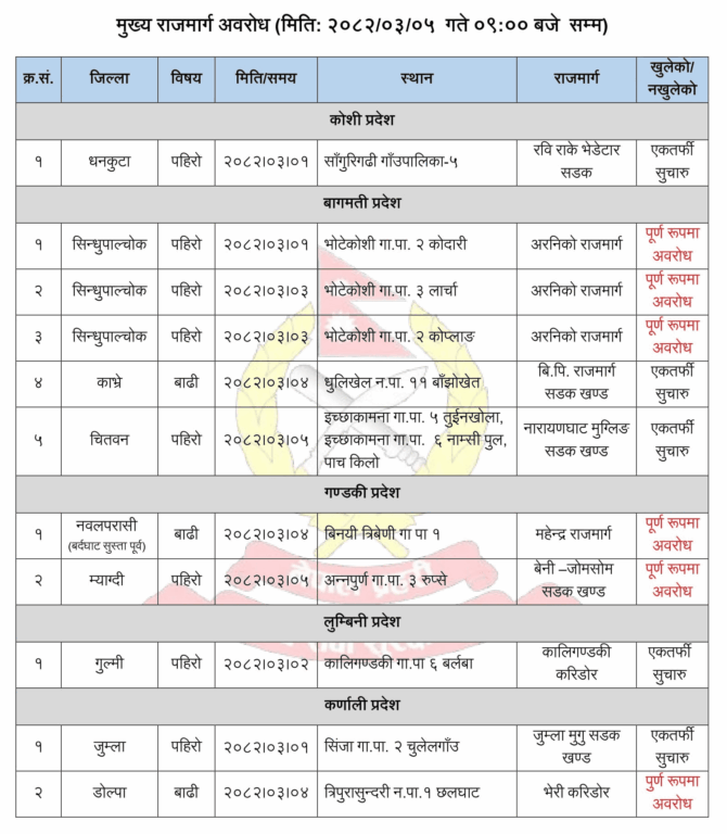 प्रहरीले धनकुटा, सिन्धुपाल्चोक, काभ्रे, चितवन, नवलपरासी, ग्याग्दी, गुल्मी, जुम्ला र डोटी जिल्लामा पर्ने ती मुख्य राजमार्गका सडक अवरुद्ध भएको जानकारी दिएको छ ।