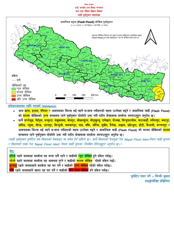 यसबाहेक झापा, इलाम, पाँचथर र आसपासका जिल्ला भई बहने ससाना नदीको बहाब उल्लेख्य बढ्ने र आकस्मिक बाढीको मध्यम जोखिमको उच्च सम्भावना रहेको बाढी महाशाखाले जनाएको छ।