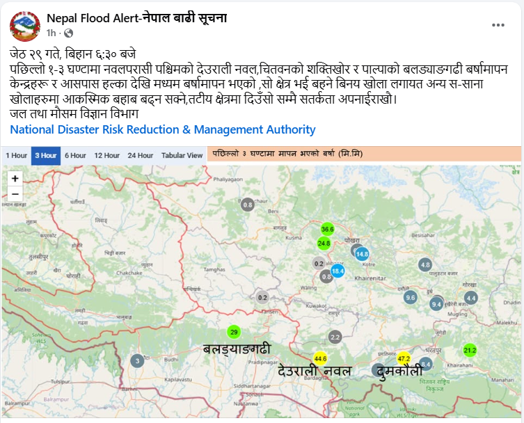 ‘पछिल्लो १–३ घण्टामा नवलपरासी पश्चिमको देउराली नवल, चितवनको शक्तिखोर र पाल्पाको बलड्याङगढी वर्षा मापनकेन्द्रहरू र आसपास हल्कादेखि मध्यम वर्षा मापन भएको, सो क्षेत्र भई वहने विनय खोलालगायत अन्य ससाना खोलामा आकस्मिक बहाब बढ्न सक्ने, तटीय क्षेत्रमा दिउँसोसम्मै सतर्कता अपनाइराखौँ’, महाशाखाले भनेको छ ।