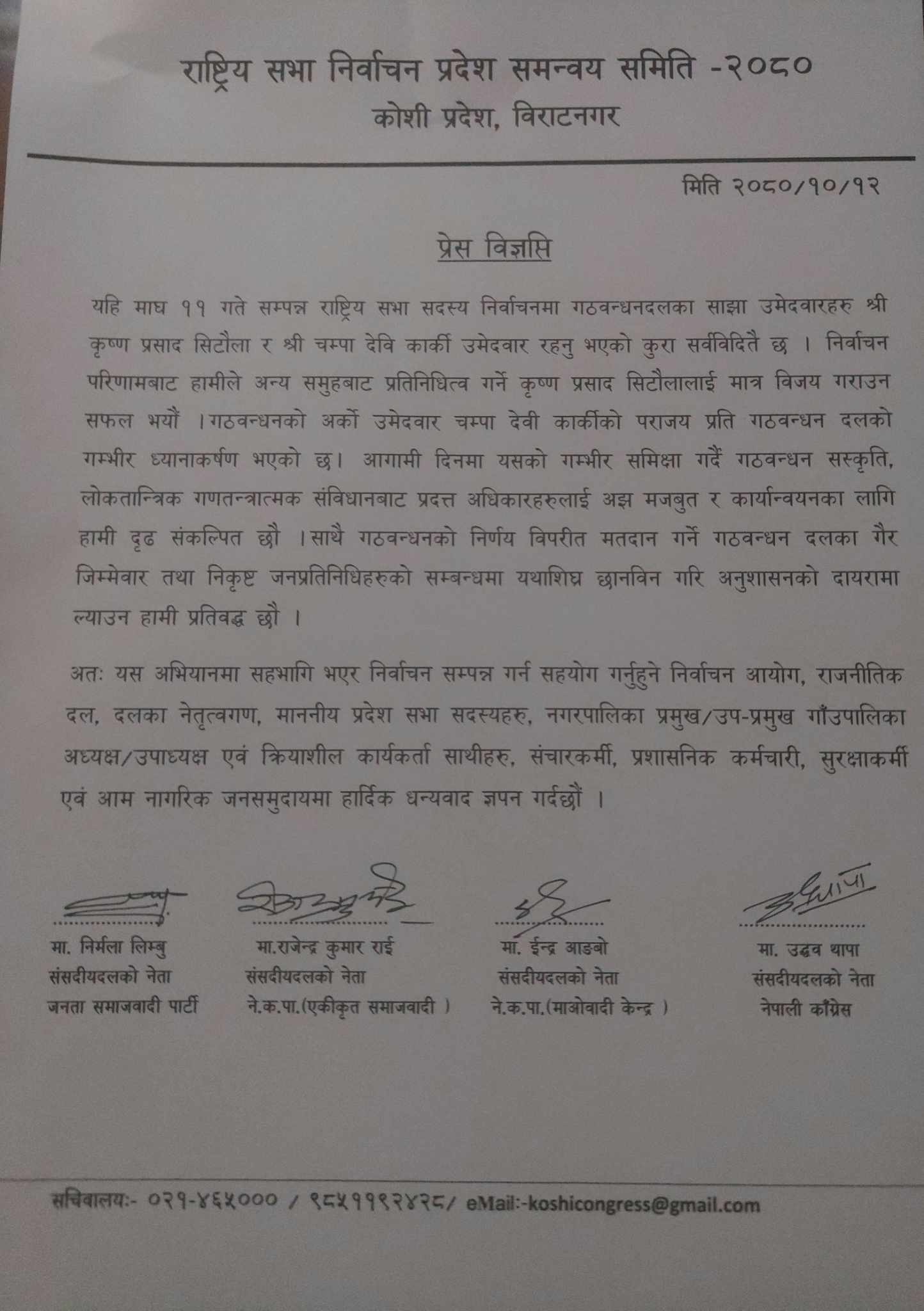बैठकपछि संयुक्त विज्ञप्ति जारी गर्दै नेताहरूले मत क्रस गर्नेलाई कारबाही गरेर गठबन्धन बलियो पार्ने बताएका छन्।नेपाली कांग्रेस दलका नेता उद्धव थापा, माओवादी नेता इन्द्र आङ्बो, एकीकृत समाजवादीका नेता राजेन्द्र राई र जसपाकी नेता निर्मला लिम्बुले विज्ञप्तीमा हस्ताक्षर गरेका छन्।