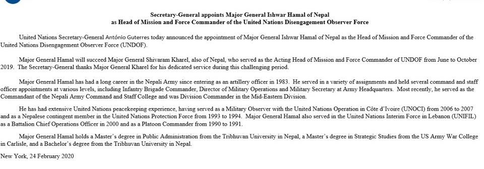 काठमाडौं– नेपाली सेनाका उपरथी ईश्वर हमाल फोर्स कमाण्डरमा नियुक्त भएका छन् । संयुक्त राष्ट्रसंघका महासचिव एन्टोनियो गुटेर्रेस्ले उपरथी हमाललाई सोमबार फोर्स कमाण्डरमा नियुक्त गरेका हुन् ।हमालले मध्यपूर्वको गोलानहाइटस्थित संयुक्त राष्ट्रसंघीय शान्ति सेनाको नेतृत्व गर्नेछन् । उक्त क्षेत्रमा नेपाललगायत झण्डै ४० देशका सैनिकहरु कार्यरत रहेका छन् । अनडफ मिसनको कार्यवाहक प्रमुख नेपाली सेनाकै उपरथी शिवराम खरेल थिए । उनले सेनाबाटै अवकास पाइसकेका छन् ।