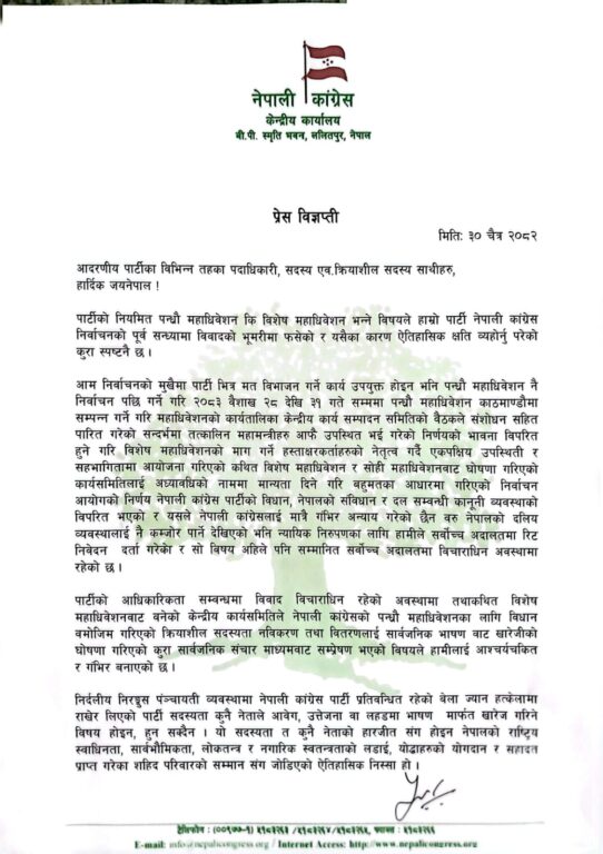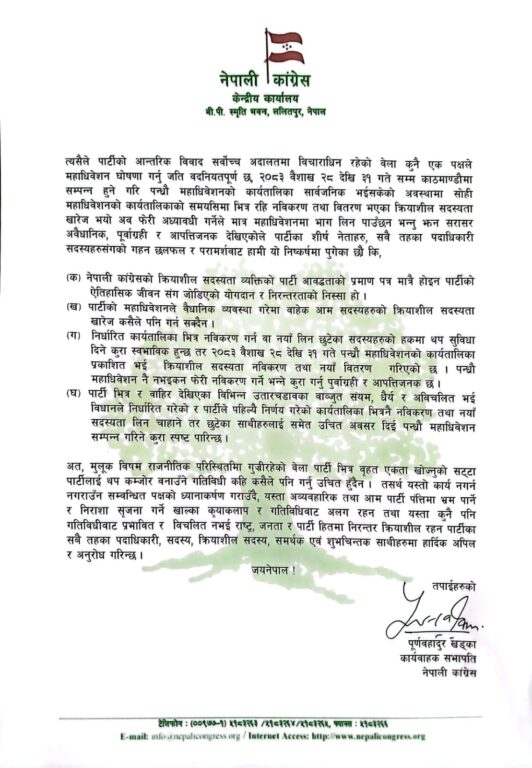 ‘निर्दलीय निरंकुश पञ्चायती व्यवस्थामा नेपाली कांग्रेस पार्टी प्रतिबन्धित रहेको बेला ज्यान हत्केलामा राखेर लिएको पार्टी सदस्यता कुनै नेताले आवेग, उत्तेजना वा लहडमा भाषणमार्फत खारेज गरिने विषय होइन, हुन सक्दैन,’ उनले भनेका छन् ।