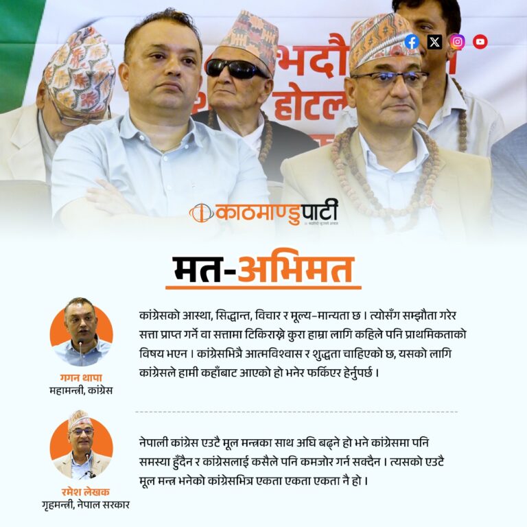उनले भने, ‘कांग्रेस पार्टीले चुनाव लड्छ, जित्न कोसिस गर्छ । सत्तामा जान्छ, शक्तिको अभ्यास गर्छ । त्यसकारण चुनाव महत्वपूर्ण छ र जित्ने आशा राख्ने कुरा स्वाभाविक हो । तर त्यो सबै कुरा होइन । सत्ता र शक्तिमा पुग्ने कुरा पनि सशर्त हो निशर्त होइन । हाम्रा आधारभूत मूल्य र मान्यतासँग सम्झौता गर्नुपर्यो भने त्यसरी प्राप्त भएको सत्ताको कुनै अर्थ रहँदैन । कांग्रेसको आस्था, सिद्धान्त, विचार र मूल्यमान्यता छ । त्योसँग सम्झौता गरेर सत्ता प्राप्त गर्ने वा सत्तामा टिकिराख्ने कुरा हाम्रो लागि कहिले पनि प्राथमिकताको विषय भएन ।’