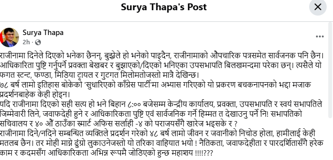 उनले लेखेका छन् ‘राजीनामा दिनेले दिएको भनेका छैनन्, बुझ्नेले हो पनि भनेको पाइँदैन। राजीनामाको औपचारिक पत्रसमेत गायब छ। यो त खालि मिलोमतो र फण्डा जस्तो मात्रै देखिन्छ।यदि राजीनामा दिएको सही सत्य हो भने बिहान ८:०० बजेसम्म केन्द्रीय कार्यालय, प्रवक्ता, उपसभापति र स्वयं सभापतिले जिम्मेवारी लिने, जवाफदेही हुने र आधिकारिकता पुष्टि एवं सार्वजनिक गर्ने हिम्मत त देखाउनु पर्ने नि! सभापतिको सचिवालय र ४० ओैं ठाउँका स्मार्ट अफिस सर्लाही -४ को पराजयसँगै खारेज भइसके र ?