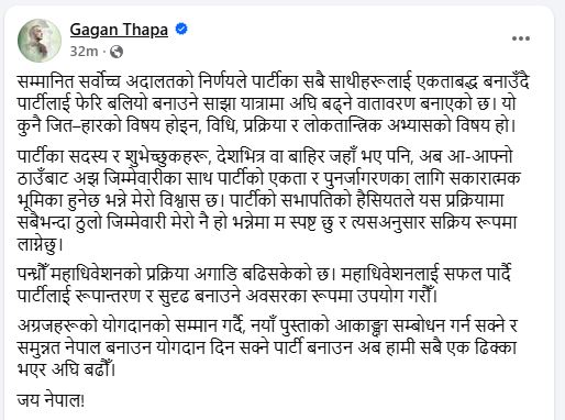थापाले सर्वोच्च अदालतको पछिल्लो निर्णयले पार्टीभित्र एकता मजबुत बनाउने वातावरण सिर्जना भएको बताए । उनले पार्टीका सबै नेता, कार्यकर्ता तथा शुभेच्छुकलाई एकताबद्ध भएर पार्टी सुदृढीकरणको यात्रामा अघि बढ्न आह्वान गरेका छन् ।