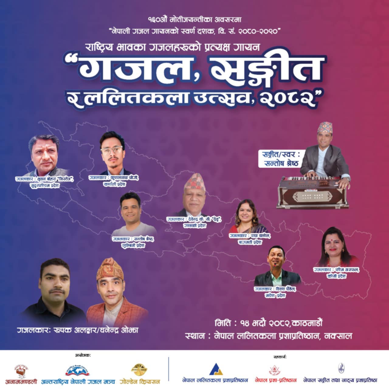 काठमाण्डु – १६०औँ मोतीजयन्तीका अवसरमा नेपाली गजल गायनको स्वर्ण दशक, (वि. सं. २०८०–२०९०) अन्तर्गत राष्ट्रिय भावका गजलहरूको प्रत्यक्ष गायन समारोहमा शनिबार काठमाण्डुमा हुँदैछ ।