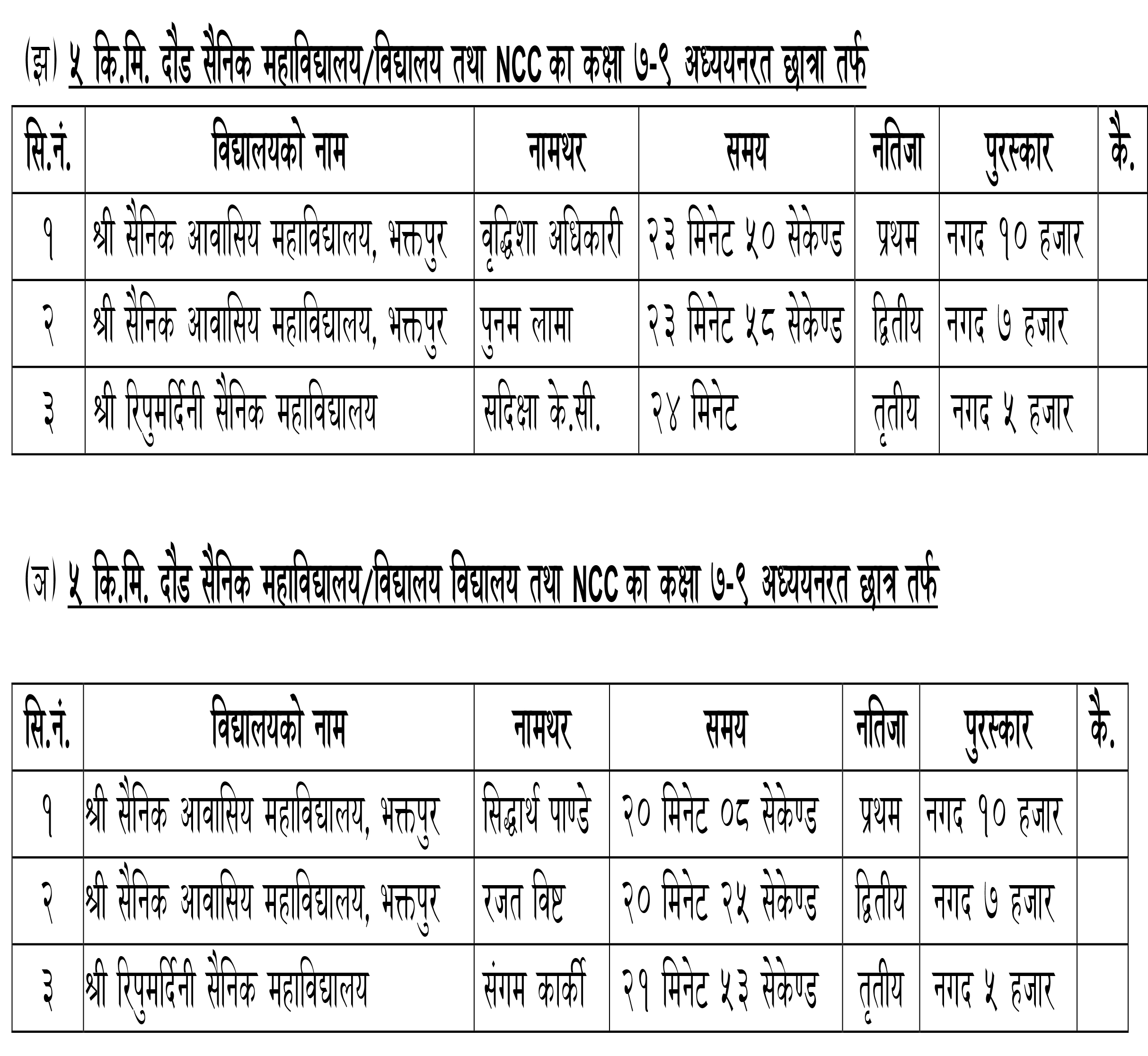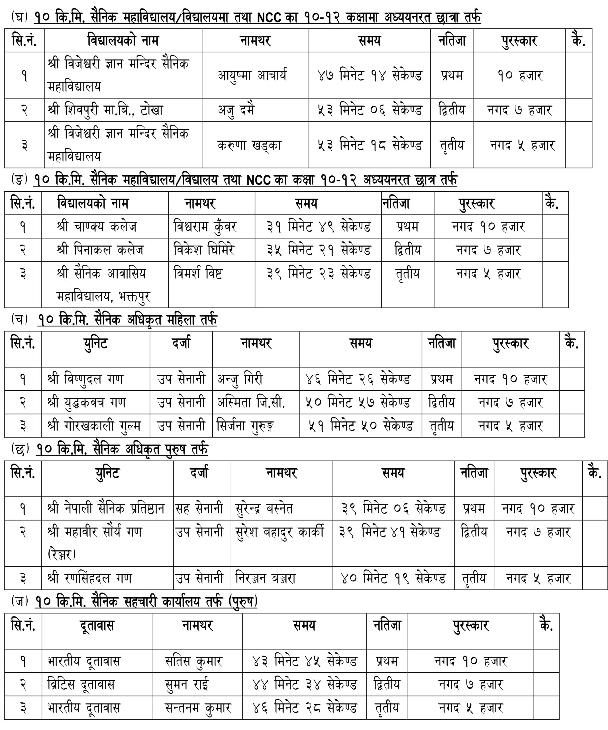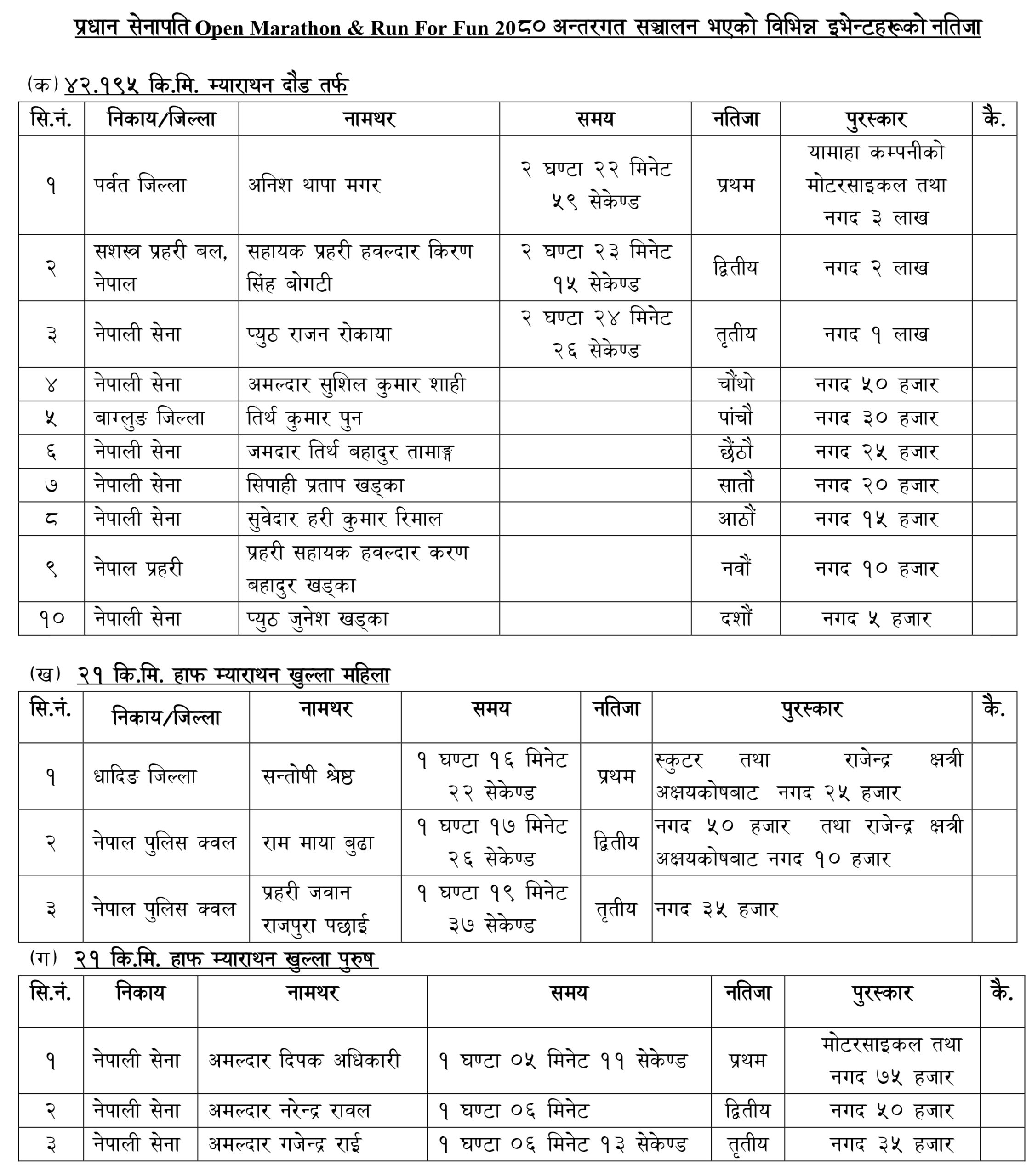 विभिन्न विधामा विजयी धावकहरूलाई प्रधानसेनापति प्रभुराम शर्मा, ओलम्पिक कमिटीका अध्यक्ष जीवनराम श्रेष्ठ, रक्षा सचिव किरणराज शर्मा, नेपाल एथलेटीक्स संघका अध्यक्ष राजीवविक्रम शाह, महारथी राजेन्द्र क्षत्री (अ.प्रा.), महारथी, बलाधिकृत रथी अशोकराज सिग्देल, काठमाडौं महानगरपालिकाका सहायक निर्देशक अनिता श्रेष्ठ र एमएडब्ल्यू राइड्स् प्रालिका महाप्रबन्धक दिपक रौनियारले पुरस्कार तथा प्रमाणपत्र वितरण गरेका थिए ।