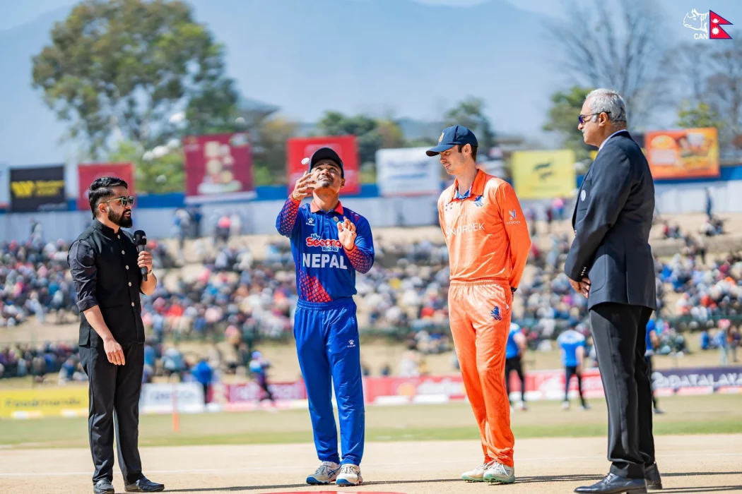 काठमाण्डु- त्रिकोणात्मक टी-२० अन्तर्राष्ट्रिय क्रिकेट शृङ्खलाको नेदरल्यान्ड्सविरुद्धको फाइनल खेलमा मंगलबार नेपालले पहिले ब्याटिङ गर्ने भएको छ । कीर्तिपुरस्थित अन्तर्राष्ट्रिय क्रिकेट मैदानमा नेपालले टस जिती पहिले ब्याटिङ गर्ने निर्णय लिएको हो ।