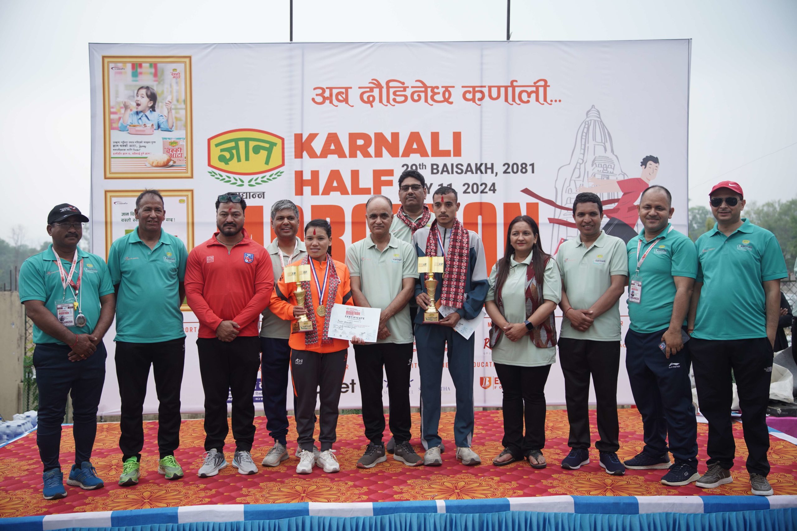 सुर्खेत – नेपाली सेनाका नरेन्द्रसिंह रावत र एपीएफ क्लबका पुष्पा भण्डारीले प्रथम ज्ञान खाद्यान्न कर्णाली हाफ म्याराथनको उपाधि जितेका छन् ।
