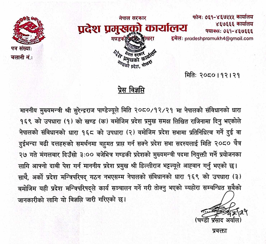 प्रदेश प्रमुखको कार्यालयले जारी गरेको विज्ञप्तिमा भनिएको छ, ‘नेपालको संविधानको धारा १६८ को उपधारा (२) बमोजिम प्रदेश सभामा प्रतिनिधित्व गर्ने दुई वा दुईभन्दा बढी दलहरूको समर्थनमा बहुमत प्राप्त गर्न सक्ने प्रदेश सभा सदस्यलाई मिति मिति २०८० चैत २७ गते मंगलबार दिउँसो ३ बजेभित्र गण्डकी प्रदेशको मुख्यमन्त्री पदमा नियुक्ती गर्ने प्रयोजनका लागि आफ्नो दावी पेश गर्न माननीय प्रदेश प्रमुख श्री डिल्लीराज भट्टज्यूले आह्वान गर्नुभएको छ ।’