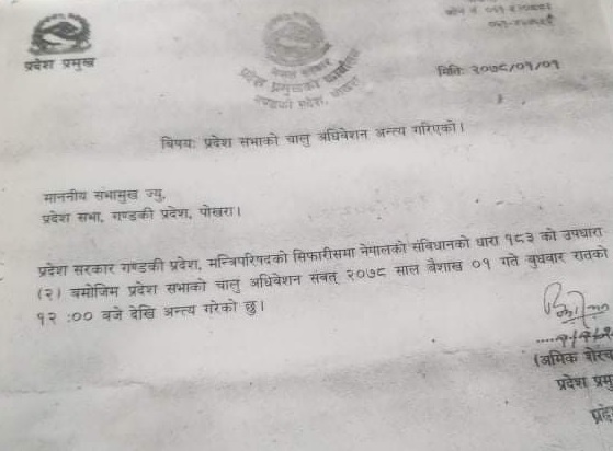 अधिवेशन अन्त्य गर्न प्रदेश सरकारले प्रदेश प्रमुखसमक्ष सिफारिस गरेको थियो । बुधबार राती १२ बजे प्रदेश सरकारको सिफारिस अनुसार गण्डकी प्रदेशसभाको चालु अधिवेशन अन्त्य भएको पत्र प्रदेश प्रमुख अमिक शेरचनले सभामुखलाई दिएका छन् ।