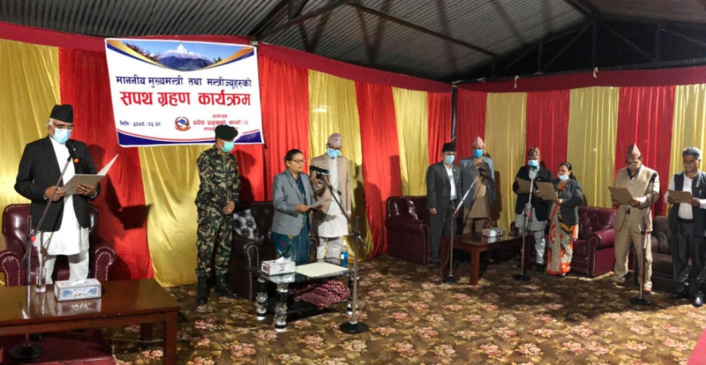 शपथ लिनेमा मुख्यमन्त्री नेपाली, मन्त्रीहरुमा कांग्रेसका कुमार खड्का, माओवादी केन्द्रकी मधुमाया अधिकारी गुरुङ, जसपाका हरिशरण आचार्य र स्वतन्त्र सांसद दीपक मनाङे छन् ।