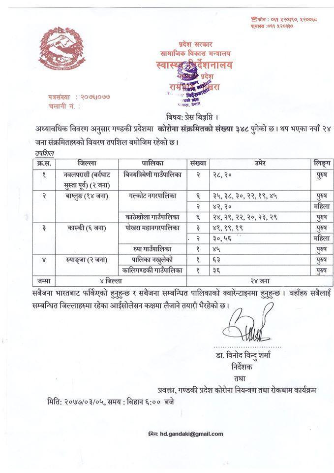 पोखरा – गण्डकी प्रदेशका कास्की, नवलपरासी(बर्दघाट सुस्ता पूर्व), बाग्लुङ र स्याङ्जामा गरी शुक्रबार बिहान २४ जना नयाँ कोरोना सङ्क्रमित थपिएका छन् ।