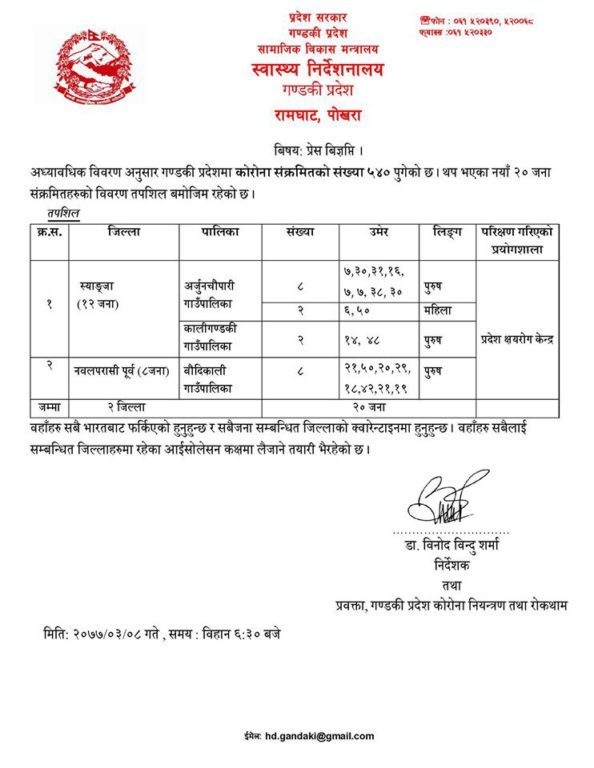 काठमाडौं – गण्डकी प्रदेशमा थप २० जना कोरोना भाइरस संक्रमित फेला परेका छन् ।स्याङ्जामा १२ जना र नवलपरासी (बर्दघाट सुस्ता पूर्व) मा ८ जना कोरोना संक्रमित थपिएको गण्डकी प्रदेश कोरोना नियन्त्रण तथा रोकथाम कार्यक्रमका प्रवक्ता विनोद विन्दु शर्माले जानकारी दिए ।