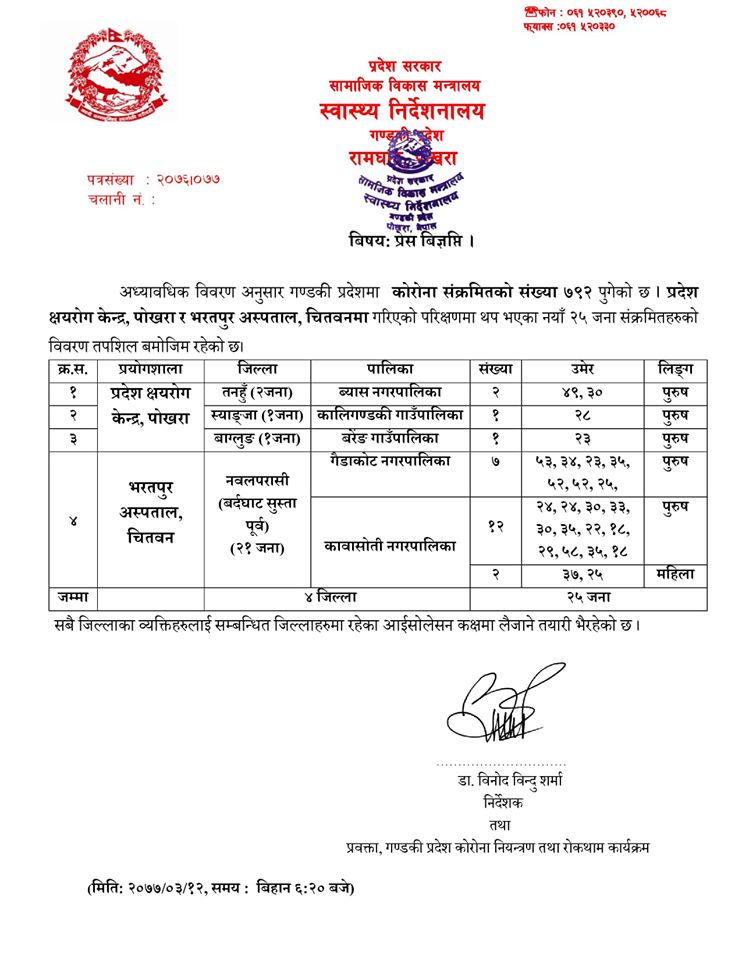 स्वास्थ्य निर्देशनालय गण्डकीका अनुसार प्रदेशका ४ जिल्लामा २५ नयाँ संक्रमित थपिएका हुन् । तनहूँमा २, स्याङ्जामा १, बागलुङमा १ र नवलपुरमा २१ गरि २५ नयाँ संक्रमित थपिएको निर्देशनालयले जनाएको छ ।