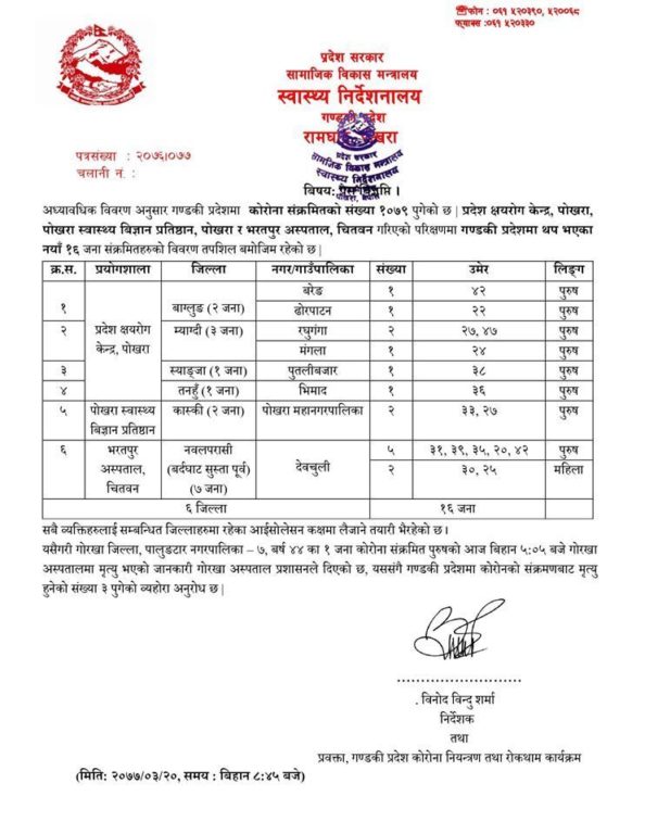 नवलपरासी पूर्वका ७ , म्याग्दीका ३, बागलुङका २, कास्कीका २, तनहुँका १ र स्जाङजाका १ जनामा संक्रमण देखिएको हो। योसँगै गण्डकी प्रदेशमा कोरोनाबाट संक्रमित हुनेको संख्या १ हजार ७९ पुगेको छ । जसमध्ये ३ जना संक्रमितको उपचारका क्रममा मृत्यु भएको भएको छ ।