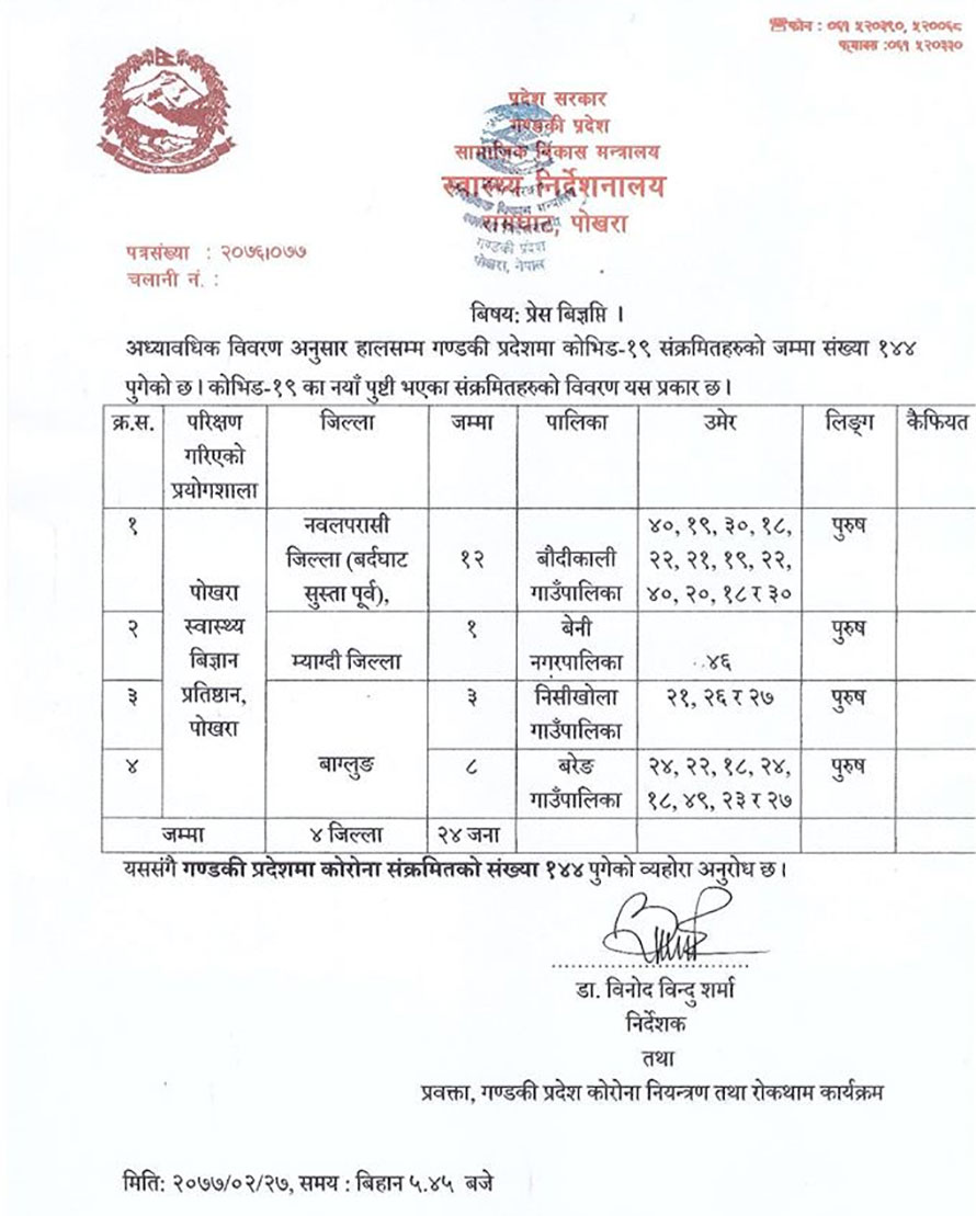 गण्डकी प्रदेश कोरोना नियन्त्रण तथा रोकथाम कार्यक्रमका प्रवक्ता डा. विनोद विन्दु शर्माका अनुसार योसँगै गण्डकी प्रदेशमा कोरोना संक्रमितहरुको संख्या १४४ पुगेको छ ।