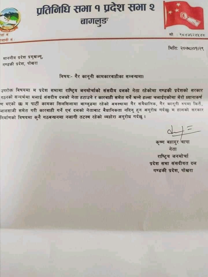 ‘गण्डकी प्रदेशको सरकार गठनको सन्दर्भमा मलाई संसदीय दलको नेताबाट हटाउने र कारबाही समेत गर्ने भन्ने हल्ला चलाइएकोमा मेरो ध्यानाकर्षण भएको छ,’ उनले विज्ञप्तिमा भनेका छन्, ‘म पार्टी कामका सिलसिलामा बाग्लुङमा रहेको अवस्थामा गैर संवैधानिक गैर कानूनीरूपमा किर्ते जालसाजीसमेत गर कारबाही गर्ने एवै दलकव नेताबाट हटाउने निर्णयलाई वैधानिकता नदिनु हुन अनुरोध गर्दछु । म हालको सरकार निर्माणको विषयमा कुनै गठबन्धनमा नलागी तटस्थ रहेको व्यहोरा अनुरोध गर्दछु ।’