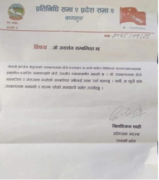 ‘नेपाली कांग्रेस नेतृत्वको गठबन्धनमा मेरो हस्ताक्षर छ भनी बाहिर विभिन्न सञ्चारमाध्याममा प्रकाशित÷प्रसारित समाचारप्रति मेरो गम्भीर ध्यानाकर्षण भएको छ । सो गठबन्धनमा मेरो सहभागीता र संलग्नता नरहेको सम्बन्धित सबैलाई स्पष्ट पार्न चाहन्छु । साथै म कुनैपनि गठबन्धनमा नभएको र तटस्थ रहेको जानकारी गराउँछु,’ सांसद शाहीले विज्ञप्तिमा भनेका छन् ।