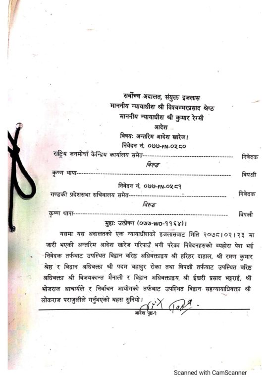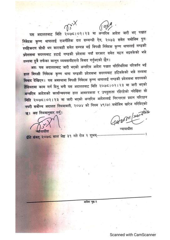 अन्तरिम आदेशविरुद्ध राष्ट्रिय जनमोर्चा केन्द्रीय कार्यालय, गण्डकी प्रदेशसभा सचिवालय र सभामुखले छुट्टा छुट्टै भ्याकेट निवेदन दर्ता गराएका थिए । निवेदनमा आज सुनुवाइ गर्दै श्रेष्ठ र रेग्मीको संयुक्त इजलासले निवेदकको माग बमोजिम आदेश खारेज गर्दै अन्तिम आदेश जारी गरेको हो ।