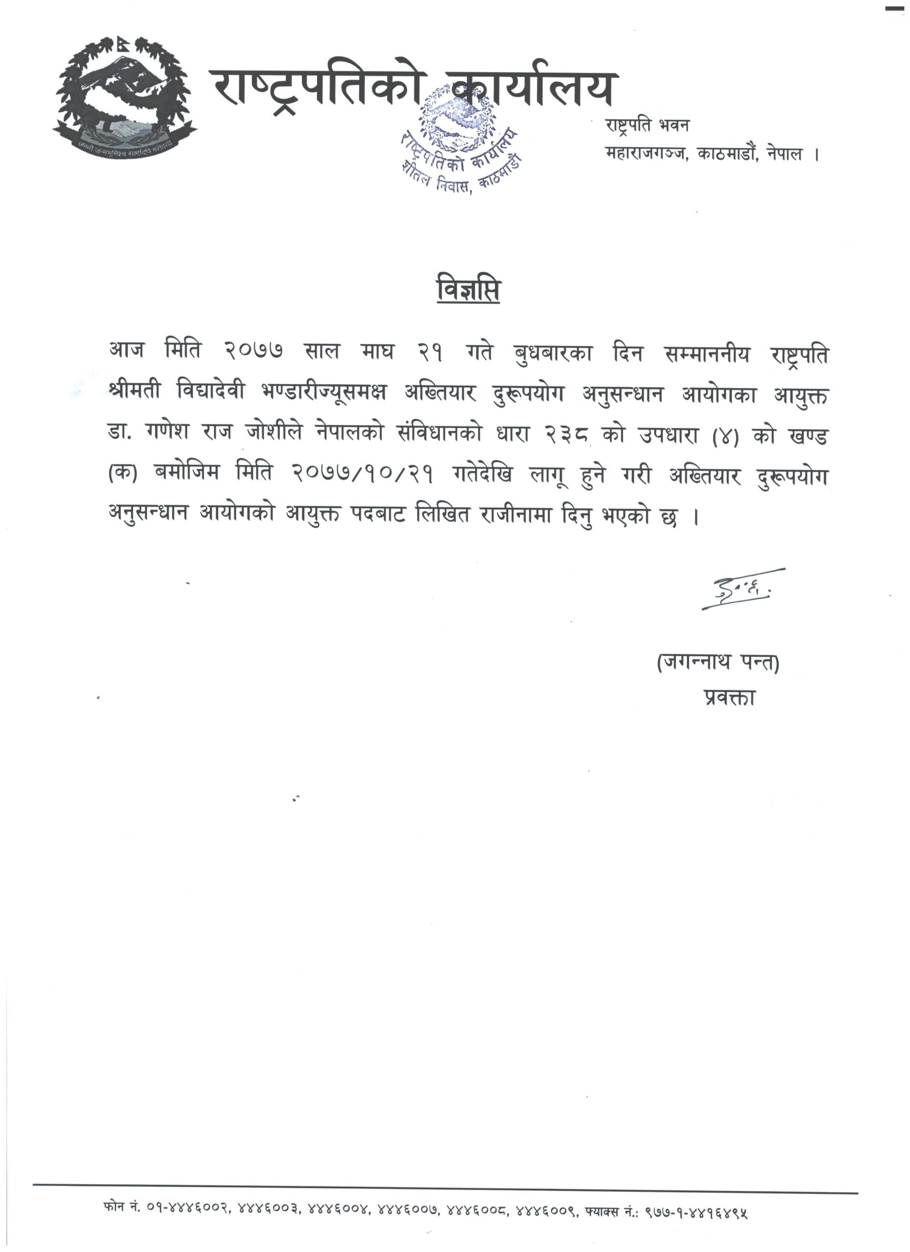 कार्यवाहक प्रमुख आयुक्त गणेशराज जोशीले राष्ट्रपति विद्यादेवी भण्डारी समक्ष राजीनामा दिएका हुन् । प्रमुख आयुक्तमा प्रेमकुमार राई नियुक्त भएपछि जोशीले राजीनामा दिएका हुन् ।