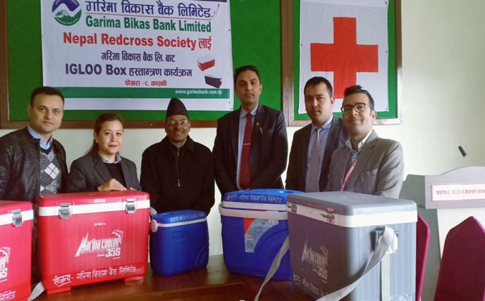 आफ्नो सामाजिक उत्तरदायित्व (सीएसआर) अन्तर्गत नेपाल रेडक्रस सोसाइटीलाई आज एक कार्यक्रमका बिच संस्थाका सभापति डोलराज पाण्डेलाई गरिमा विकास बैंक महेन्द्रपुलका शाखा प्रमुख दिपेन्द्र पोख्रेलले उक्त इग्लोबक्स (आइस ब्याग) हस्तान्तरण गरे ।
