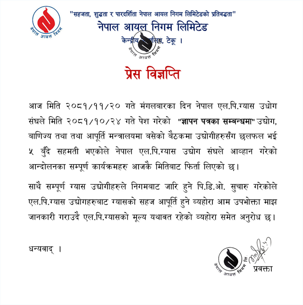 मंगलबार नेपाल एलपी ग्यास उद्योग संघले सरकारसँग भएको सहमतिपछि आन्दोलनका कार्यक्रम फिर्ता भएको जनाउँदै ग्यास उद्योगहरूबाट अब ग्यास सहज उपलब्ध हुने जनाइएको छ ।
