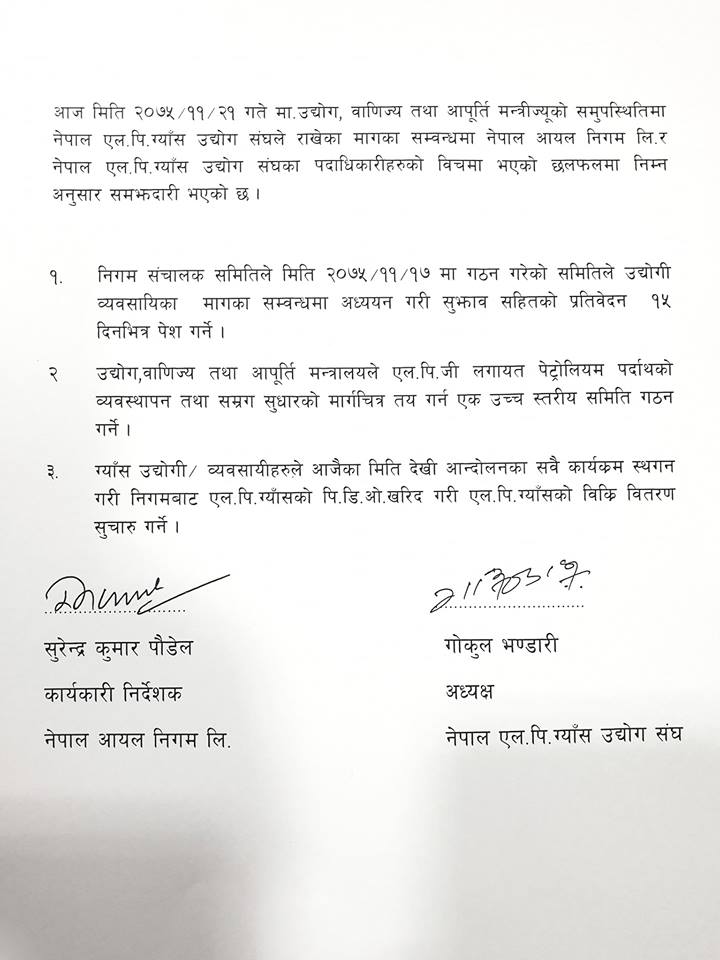 काठमाडौं ग्यास उद्योगी र नेपाल आयल निगमबीच ३ बुँदे सहमति भएको छ। ग्यास बिक्रीमा कमिसन बढाउनुपर्ने माग राखी आन्दोलनरत उद्योगी र निगमबीच मंगलबार तीन बुँदे समझदारी भएसँगै  आन्दोलन स्थगित भएको हो।