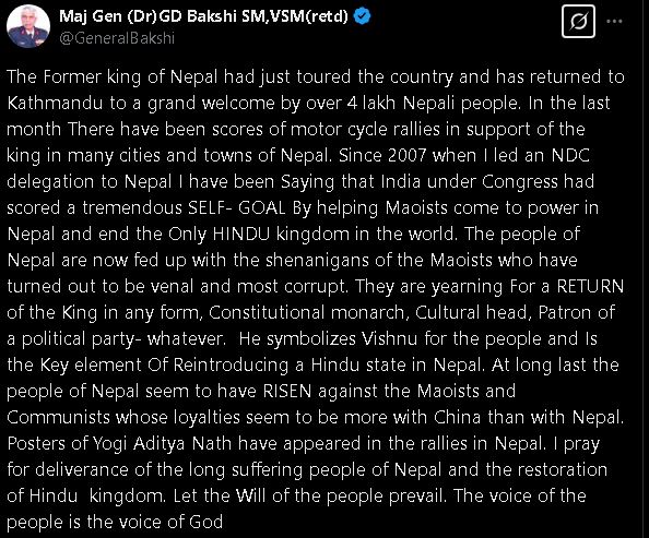 नेपालमा पूर्वराजा ज्ञानेन्द्र शाहको पोखराबाट काठमाडौं फर्कने क्रममा उनको स्वागतमा हजारौंको भीड उपस्थित भएको सन्दर्भलाई जोड्दै बख्सीले भनेका छन्, ‘ गत महिना नेपालका धेरै शहर र गाउँहरूमा राजाको समर्थनमा र् यालीहरू भएका छन् । सन् २००७ मा मैले एनडीसी प्रतिनिधिमण्डलको नेतृत्व गर्दै नेपाल आउँदादेखि नै भन्दै आएको छु–कांग्रेसको नेतृत्वमा भारतले माओवादीहरूलाई नेपालमा सत्तामा आउन र विश्वको एक मात्र हिन्दू राज्यको अन्त्य गर्न मद्दत गरेर ठूलो स्वार्थ हासिल गरेको थियो ।’