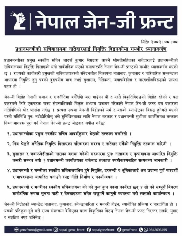 फ्रन्टले एक विज्ञप्ति जारी गर्दै भनेको छ, ‘प्रधानमन्त्रीका प्रमुख स्वकीय सचिव आदर्शकुमार श्रेष्ठद्वारा आफ्नै श्रीमतीसहितका नातेदारलाई प्रधानमन्त्रीको सचिवालयमा नियुक्ति दिलाएको भनी सार्वजनिक भएको समाचारप्रति नेपाल जेनजी फ्रन्टले गम्भीर ध्यानाकर्षण भएको छ।’